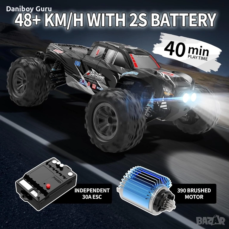 RC количката е бърза, оборудвана с 390 четков двигател, който позволява на колата с дистанционно управление за възрастни да достигне максимална скорост от 48+KMH което прави RC количките да се състезават по-бързо от другите.