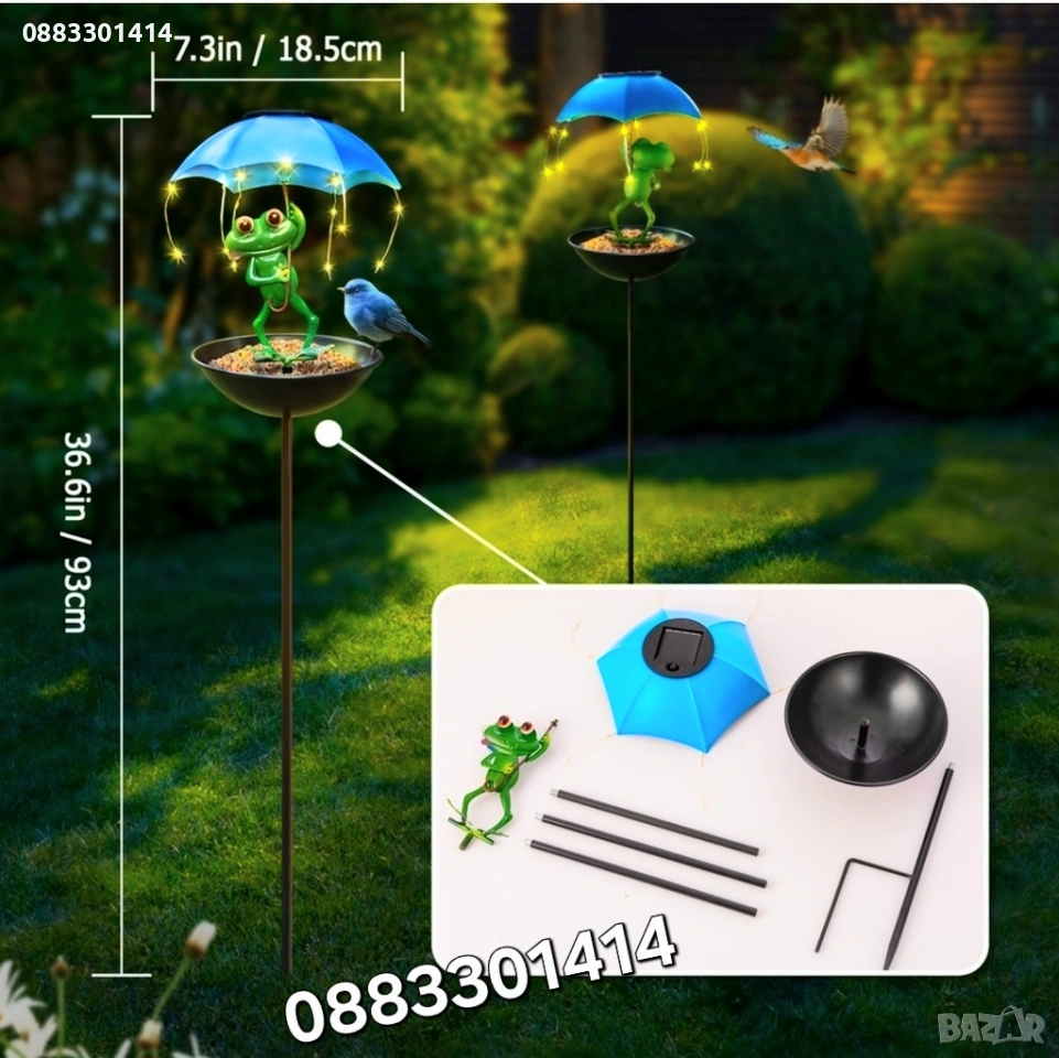 Този продукт е декоративна соларна лампа за градина под формата на жаба с чадър, която функционира и като хранилка за птици.
