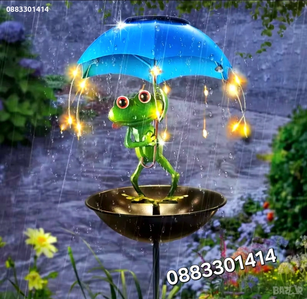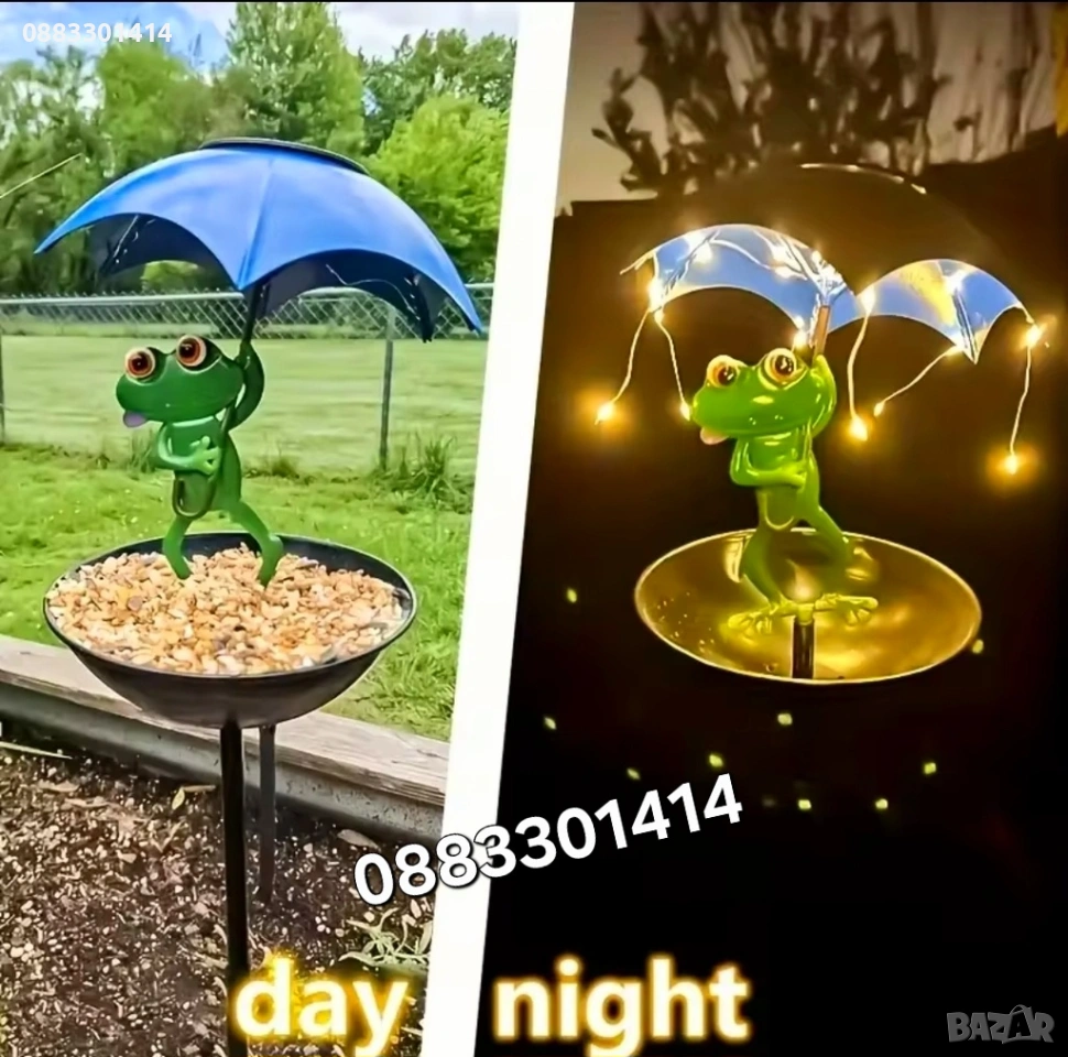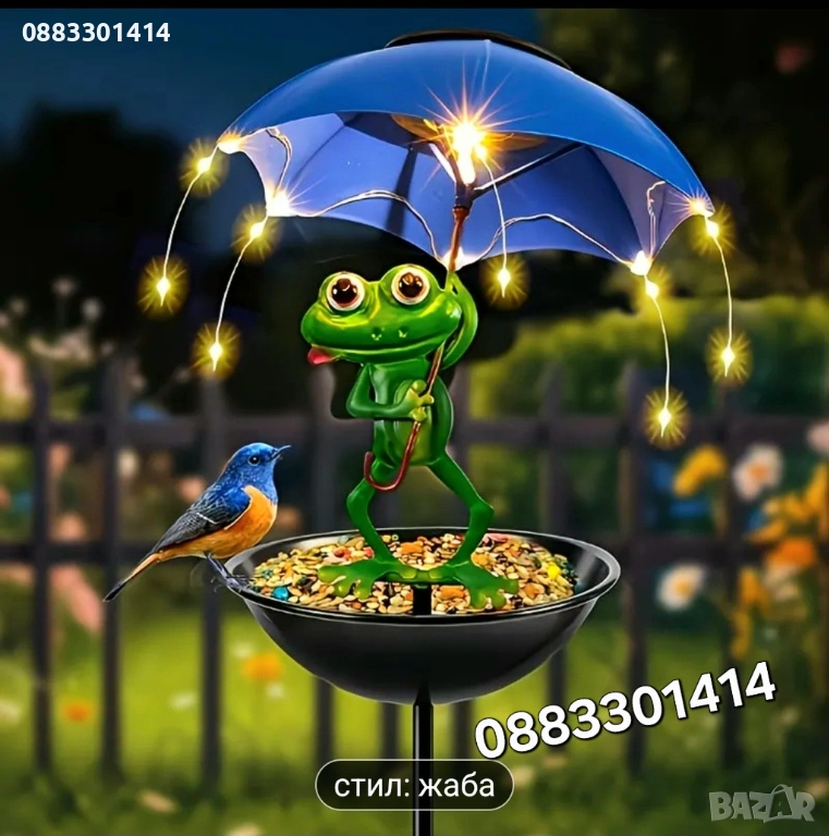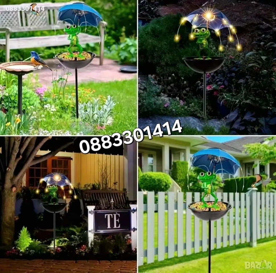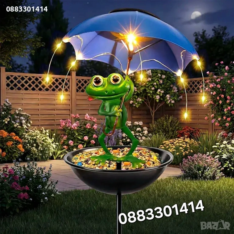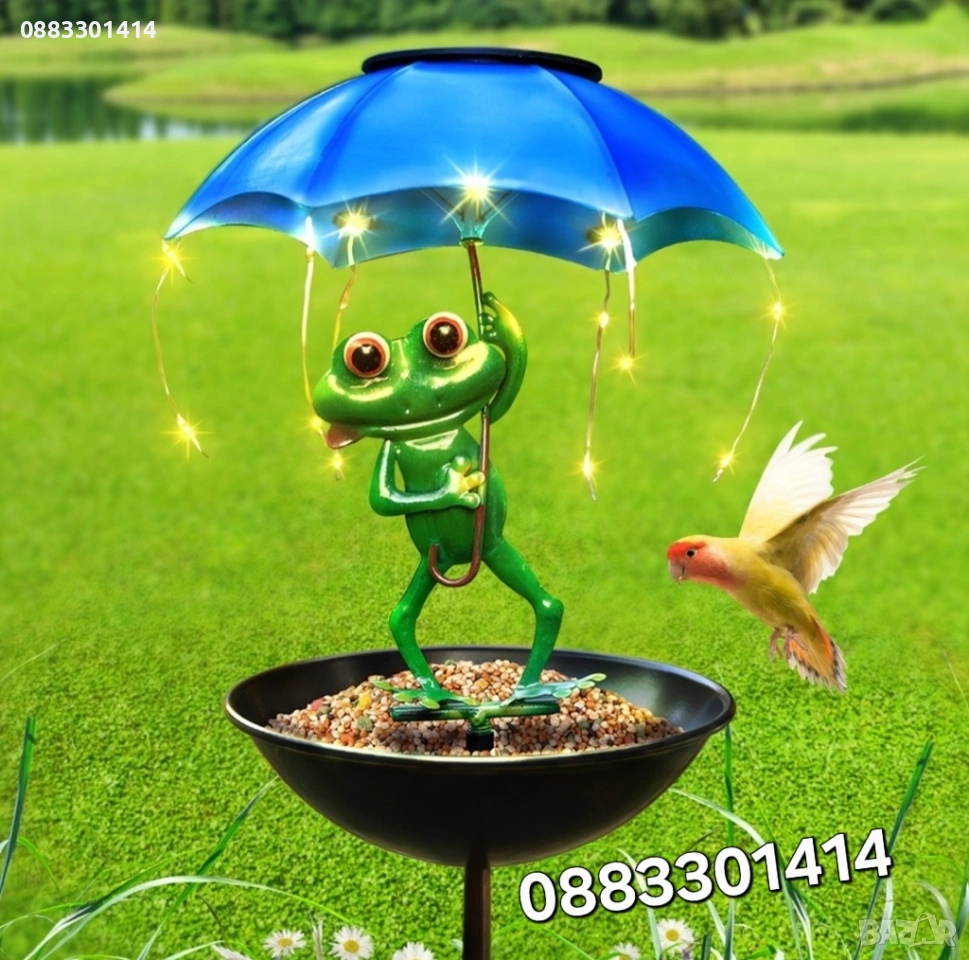Декоративна соларна жаба с лампа за птичи хранилка. Изработена от висококачествени материали, с ярки светодиодни светлини, които придават уютна атмосфера на вашата градина или двор през нощта. Перфектен декоративен аксесоар за дома и градината.