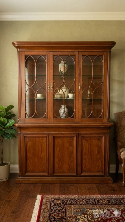 Изискан дизайн: Горната част разполага с три остъклени врати с красиви овални орнаменти, перфектни за излагане на фин порцелан или кристални сервизи.