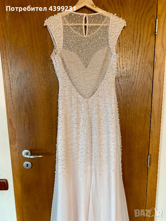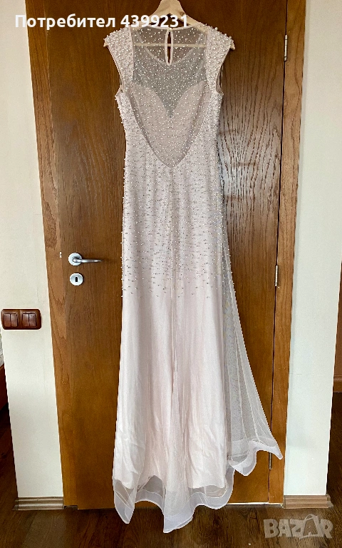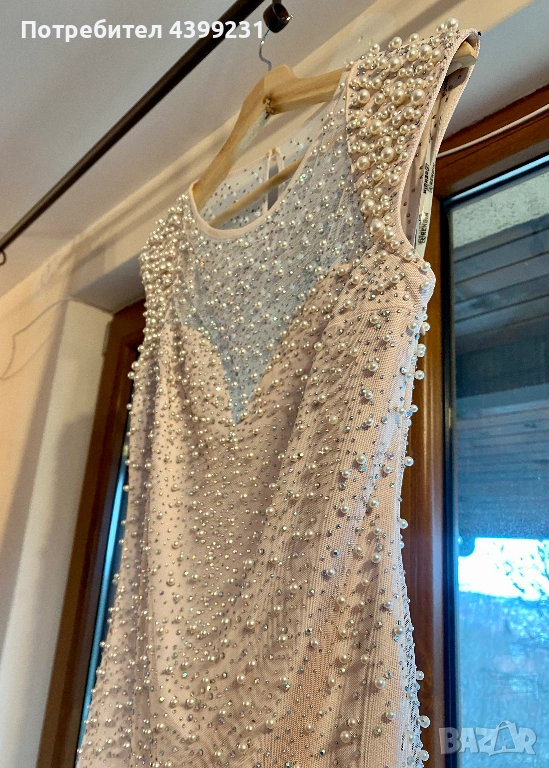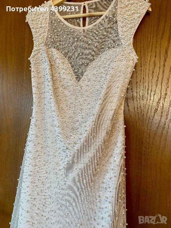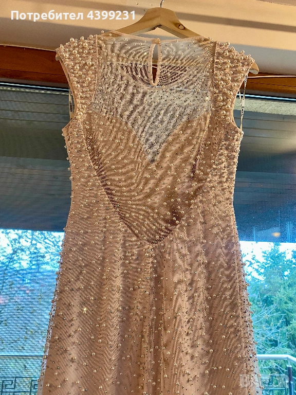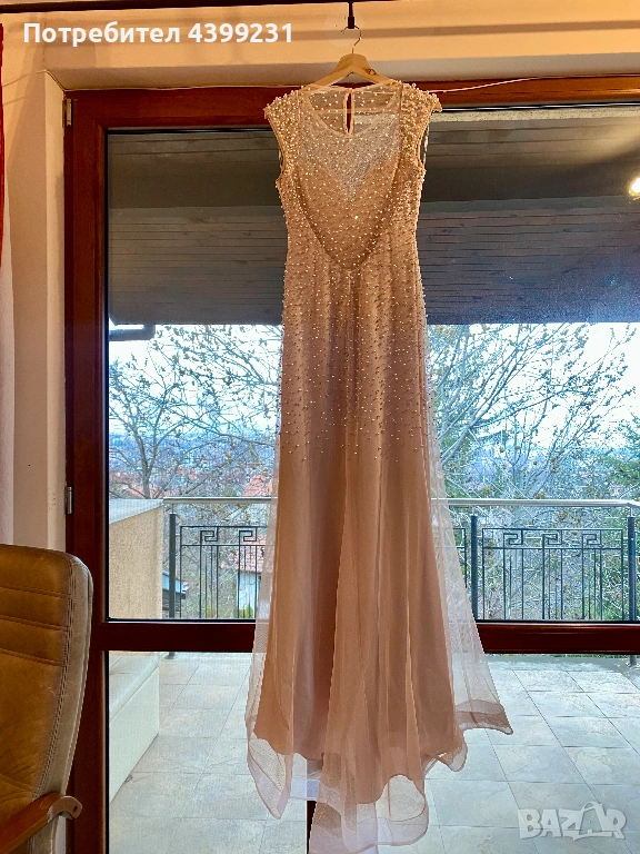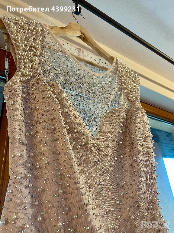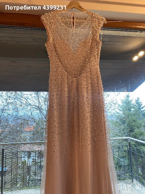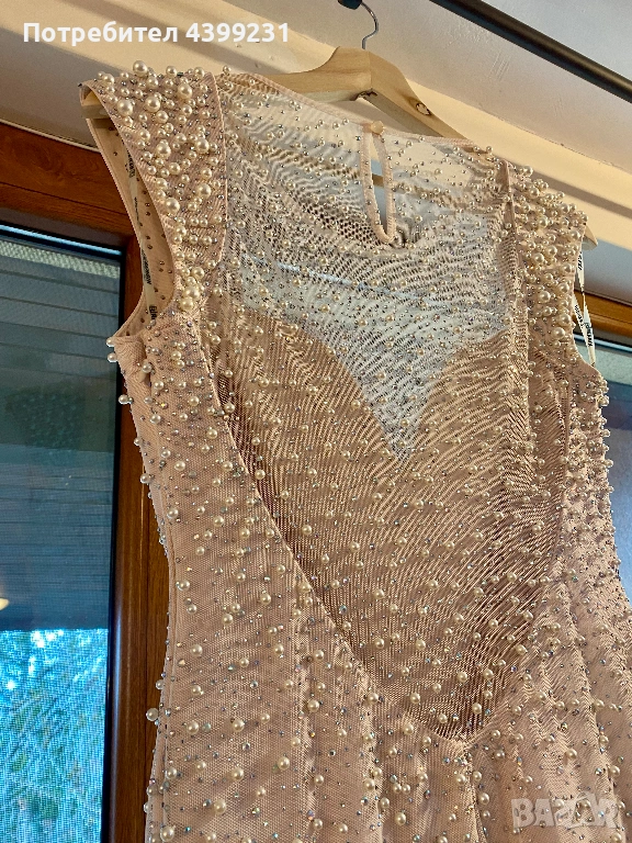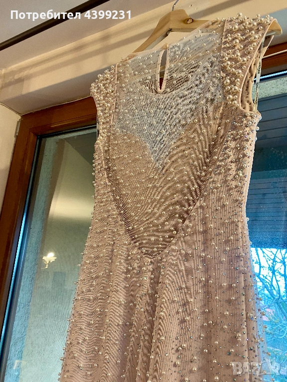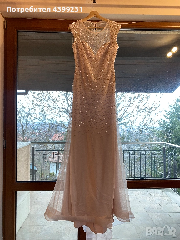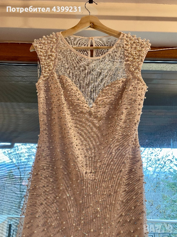 Предлагам изключително стилна и изискана официална рокля, създадена да впечатлява. Моделът е в нежен нюд/шампанско цвят, богато декориран с фино разположени перли и блестящи кристали, които улавят светлината при всяко движение.