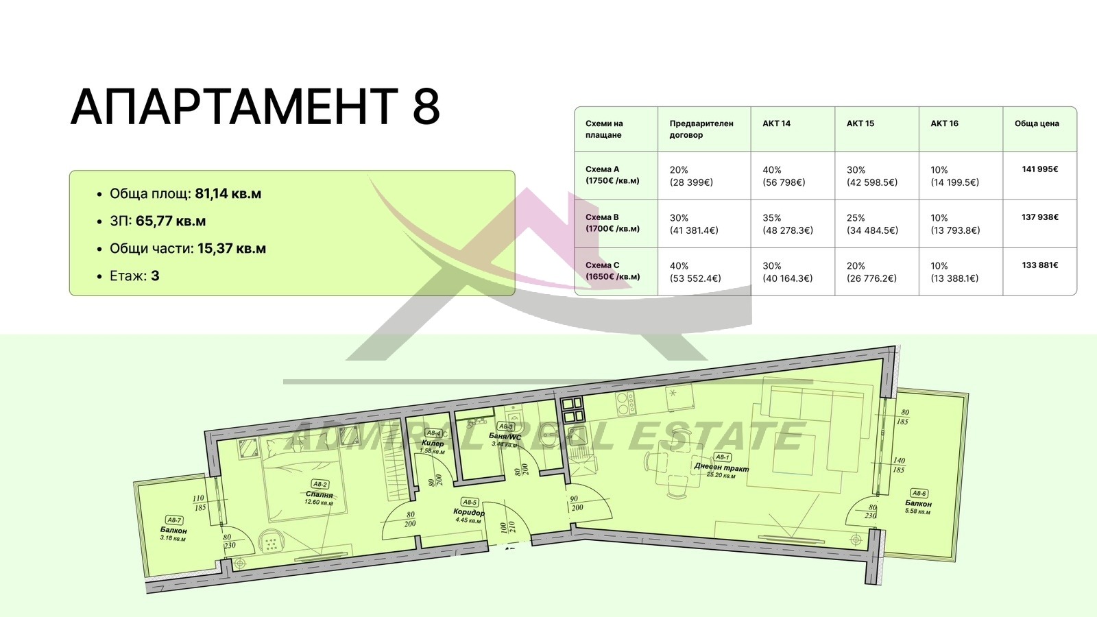 Агенция за недвижими имоти Адмирал Риъл Естейт предлага за продажба двустаен апартамент, разположен в района на Галата, гр. Варна. Жилището е с обща площ от 81 кв м , разположено на трети етаж в новострояща се сграда. Разпределението е функционално и удобно, като включва просторна дневна с кухненска част, самостоятелна спалня, баня с тоалетна, килер, балкон и тераса, осигуряващи допълнително пространство и комфорт. Сградата е в процес на строителство, стартирало на 24.02.2026 г., като се очаква достигане на Акт 14 през есента на 2026 г. и въвеждане в експлоатация (Акт 16) през пролетта на 2027 г. Проектът се изпълнява с високо качество на строителство, съобразено със съвременните стандарти за енергийна ефективност и комфорт. Предвидена е възможност за закупуване на подземно или външно паркомясто, което осигурява удобство и сигурност за бъдещите собственици. Локацията в кв. Галата предлага спокойствие, чист въздух и близост до морето, съчетани с удобен достъп до града. В района се намират плаж Галата, зелени площи за отдих, хранителни магазини, заведения и спирки на градски транспорт, осигуряващи лесна връзка с централната част на Варна. Имотът е подходящ както за лично ползване, така и за инвестиция, поради добрата си локация, функционално разпределение и перспективи за развитие на района. Номер на обявата: 231022 . За повече информация и огледи: Николай Димитров 0896 88 43 73