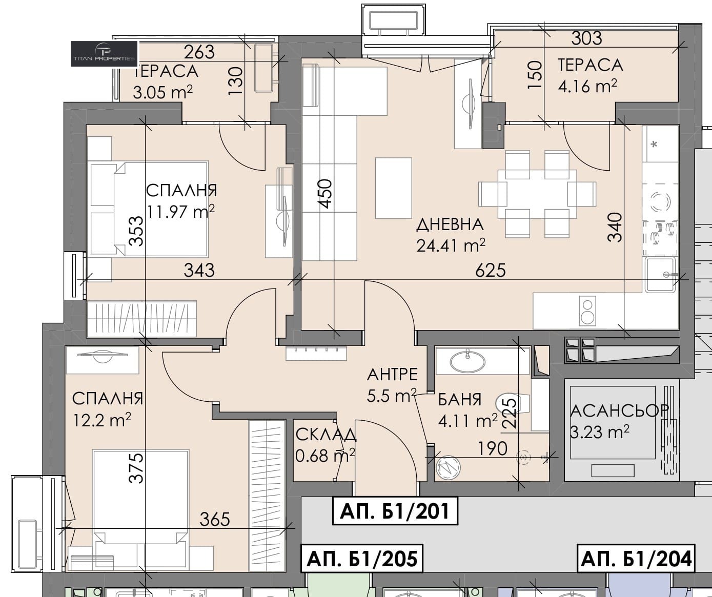 Сградата е с монолитна стоманобетонна конструкция. Апартаментите ще бъдат завършени по БДС:
