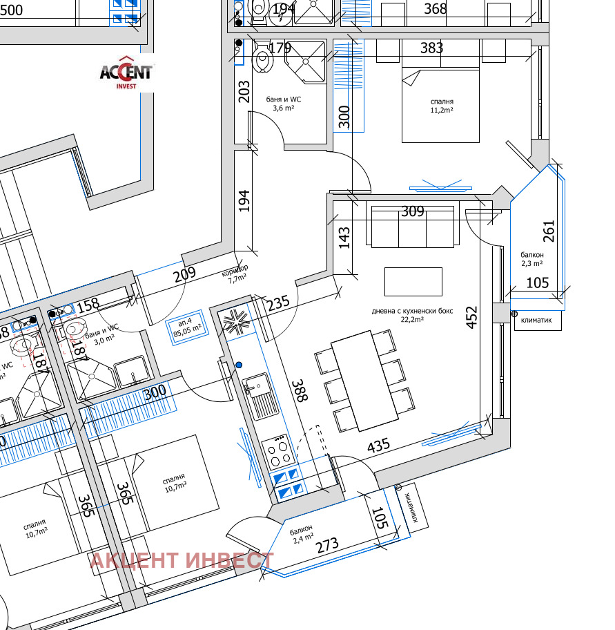 Акцент Инвест ви предлага Тристаен Апартамент с изложение Изток-Югоизток и площ от 85,08 кв.м. находящ се на партерен етаж в сграда на четири етажа.