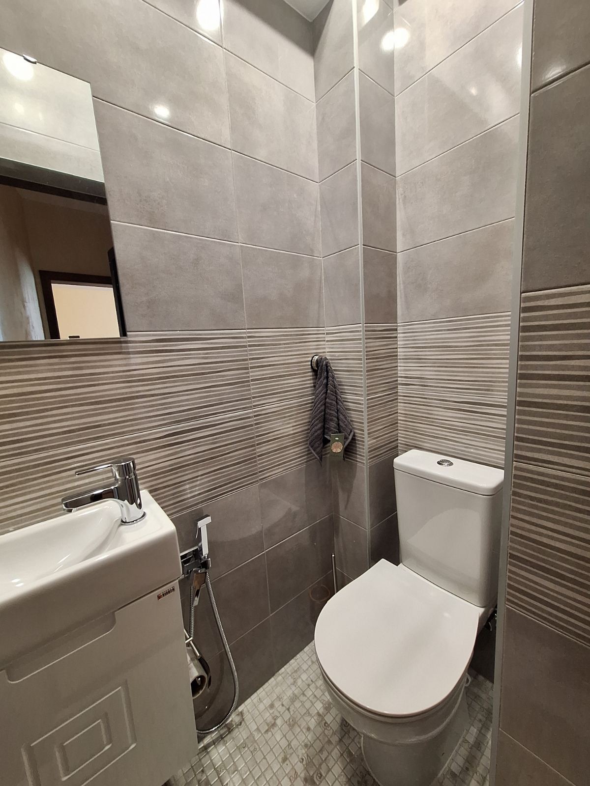 Разпределение: входно антре, кухненски бокс с хол и трапезария, две спални, кабинет, баня с тоалетна, отделно тоалетна.