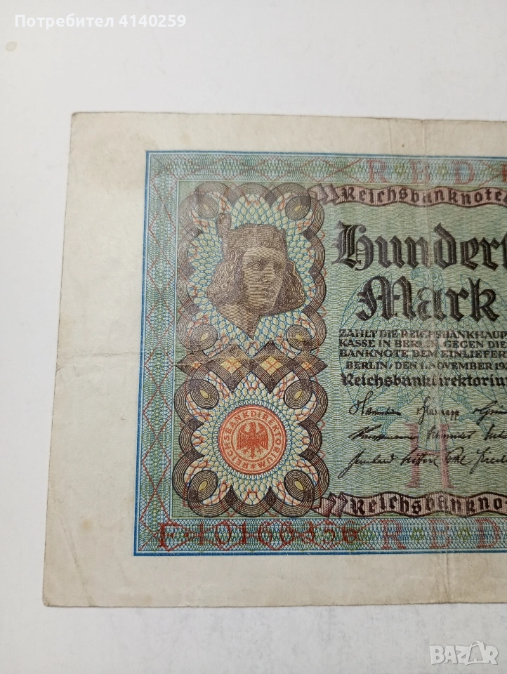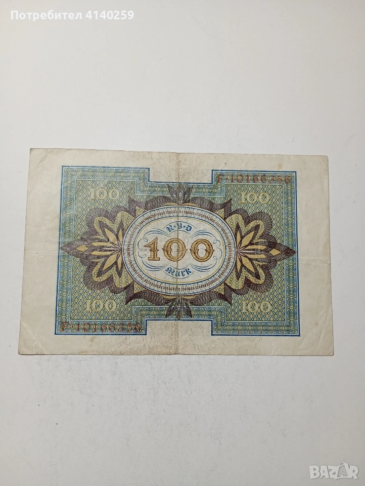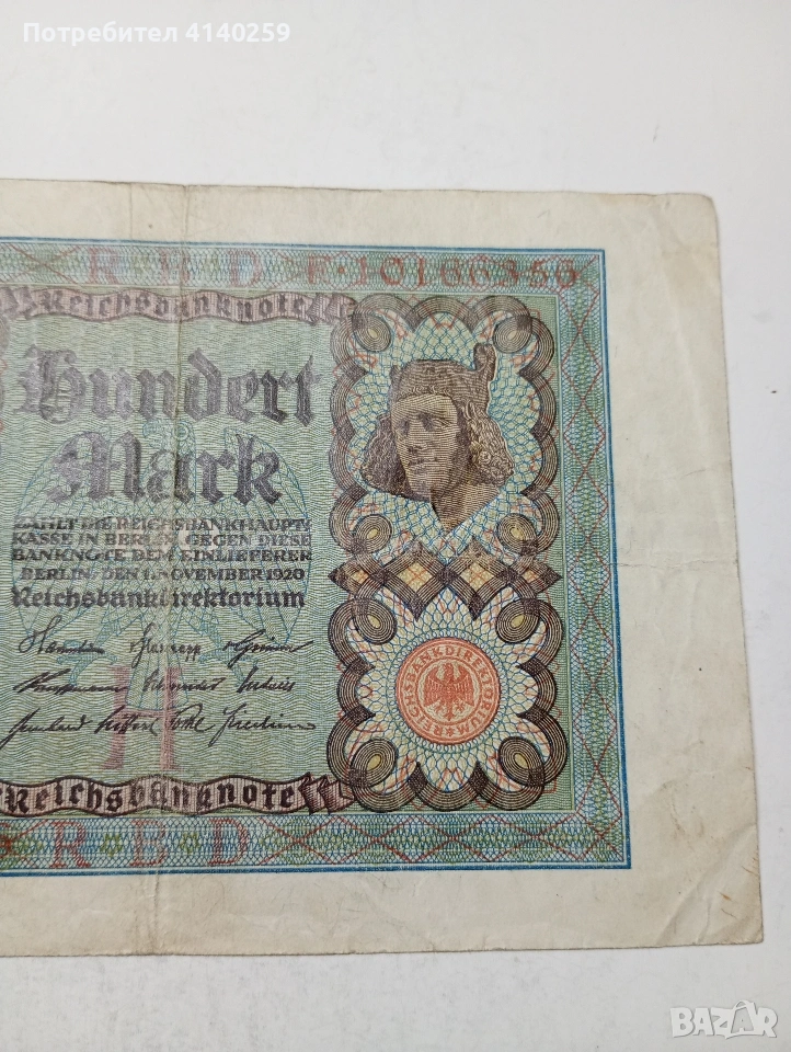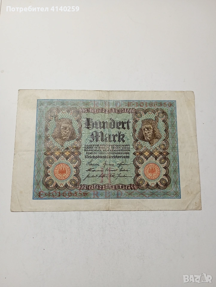 ГЕРМАНИЯ БАНКНОТА 100 МАРКИ 1920 Г СЪСТОЯНИЕ ВИДИМО ПОЛУЧАВАТЕ СНИМАНАТА БАНКНОТА РАЗГЛЕДАЙТЕ ДРУГИТЕ МИ ОБЯВИ ДА КОМБИНИРАТЕ ДОСТАВКА ЕКОНТ ЗА ВАРНА ЛИЧНО