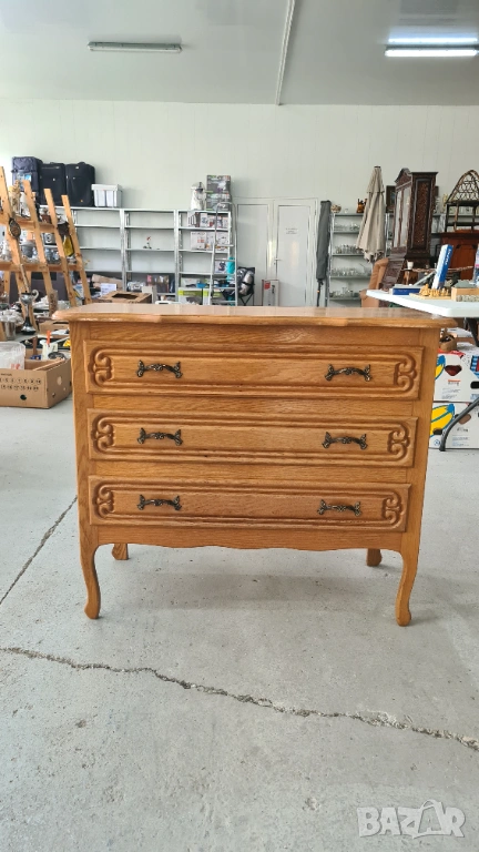 Фронтална част: Трите чекмеджета са декорирани с елегантни фрезовани рамки с характерни извивки в ъглите, които придават обем и характер на мебелта.