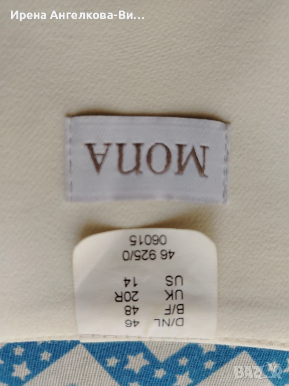 Предлагам за продажба дамско сако на немската марка Мона. Гръдната обиколка е 110 см. Дължината е 60 см.