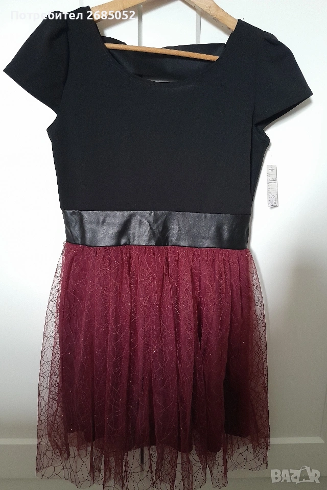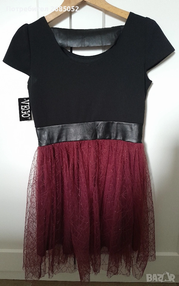 Дамска рокля с къс ръкав в черно и винено червено,размер М.Българско производство.Ширина под мишниците 42 см., от рамо до рамо 36 см.,дължина 82 см..