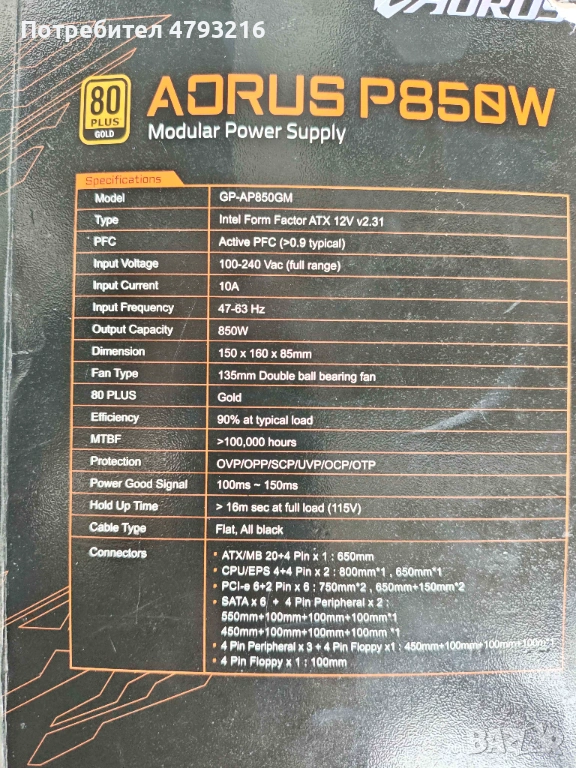 Захранване Gigabyte 850W GOLD AP850GM → Обява 54204647