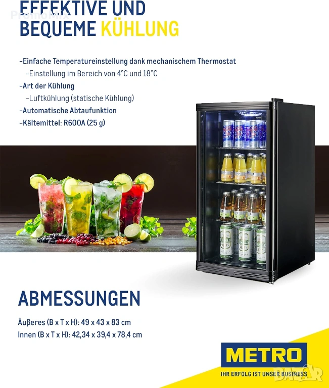 Корпуса на уреда е изработен от неръждаема стомана, метални рафтове и стъклена врата, които позволяват лесното и бързо почистване.