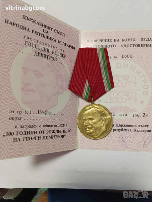 100 години от РОЖДЕНИЕТО на ГЕОРГИ ДИМИТРОВ 1882-1982г. ЮБИЛЕЕН СОЦ НРБ МЕДАЛ с оригинално удостоверение за награждаването. Подходящ за колекции, възстановки и други.