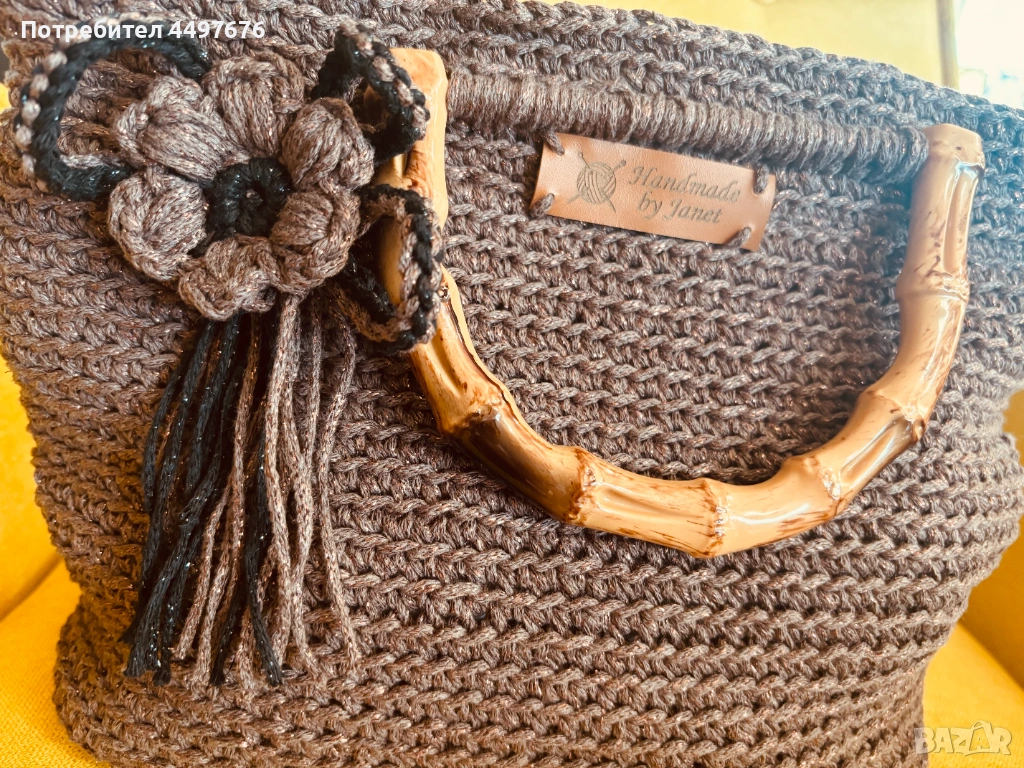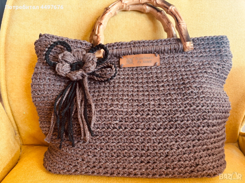 Handmade by Janet ART ви предлага елегантна дамска чанта, изплетена на една кука от памучно макраме - MACRAME COTTON LUREX с ламе. Плътно еко дъно с размери дължина 25см., ширина около 12-13 см. Чантата се затваря с цип, а отвътре е с хастар. Дръжки - естествен лакиран бамбук. Габаритни размери на чантата - ширина - около 30см. и височина - около 21-22см. Аранжирана е с красиво цвете в два цвята - кафяво и черно макраме от същия вид. Елегантна, практична и удобна както за всеки ден, така и за официален случай.Единична бройка.