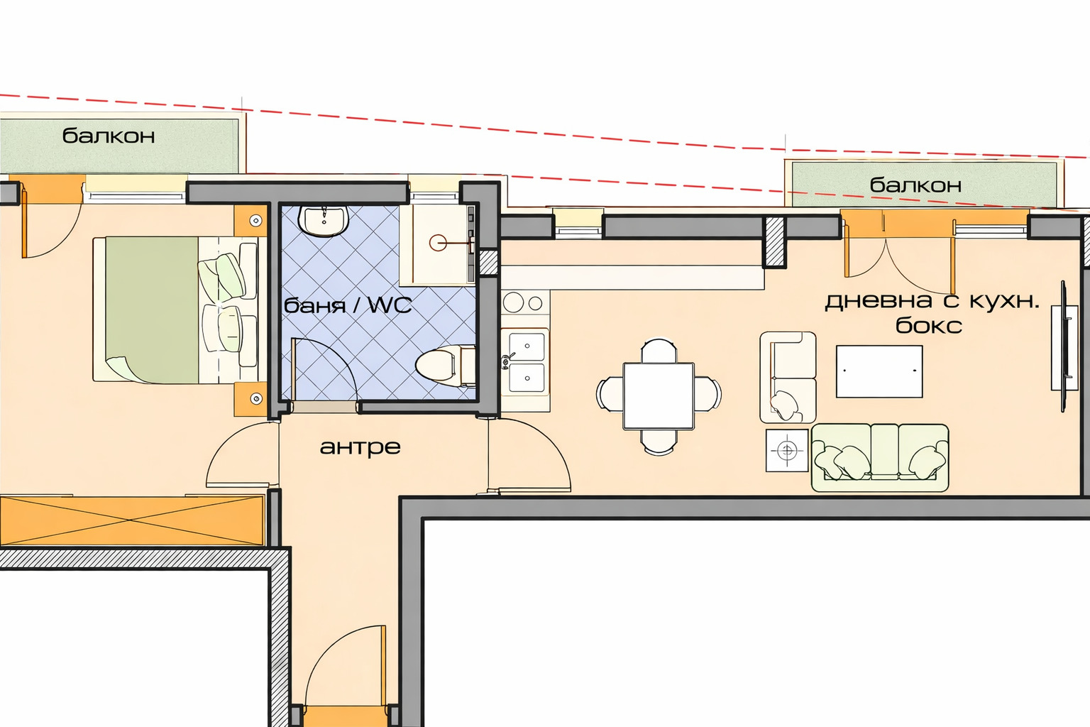 Имотът представлява: Входно антре, голяма дневна с кухненски бокс, спалня, два балкона и баня с тоалет.