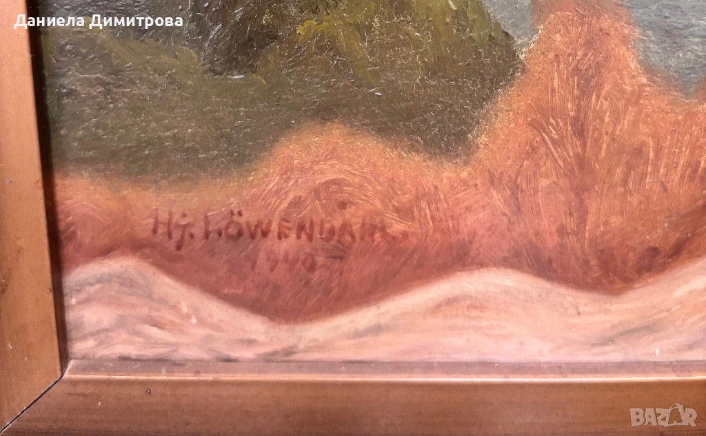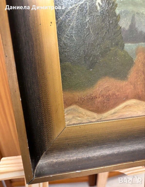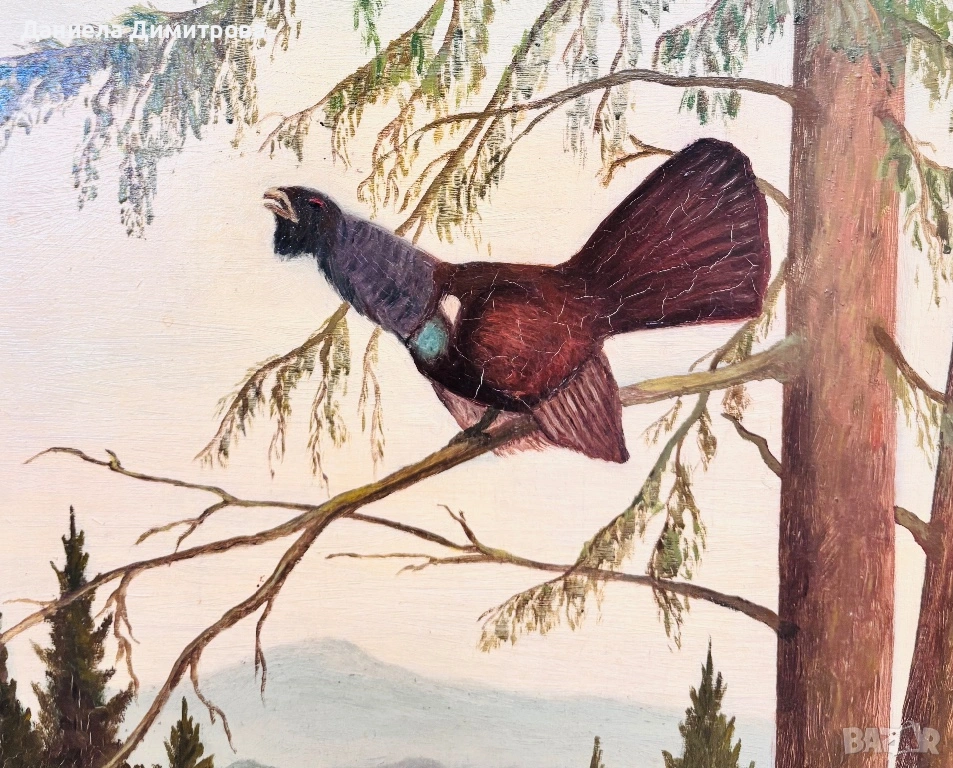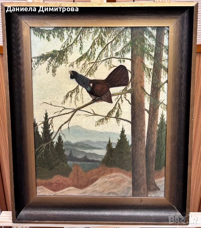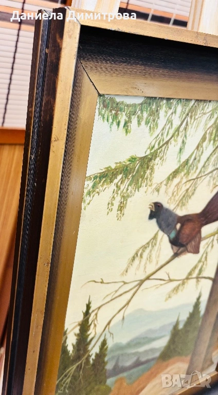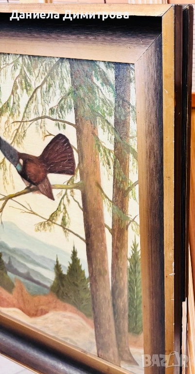 Рисувана картина на фазер с дървена рамка, изобразяваща планински пейзаж с глухар