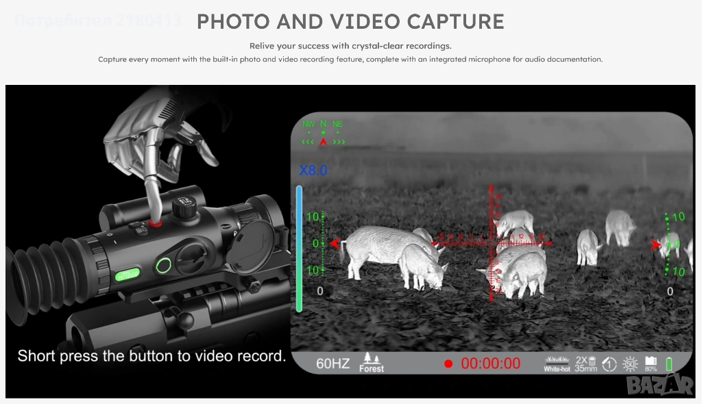 За разлика от стандартните модели, тук резолюцията позволява изключително детайлно изображение. Можете да разпознаете животно или обект на много по-голямо разстояние, като детайлите (рога, копита, малки обекти) остават ясни дори при цифрово увеличение.