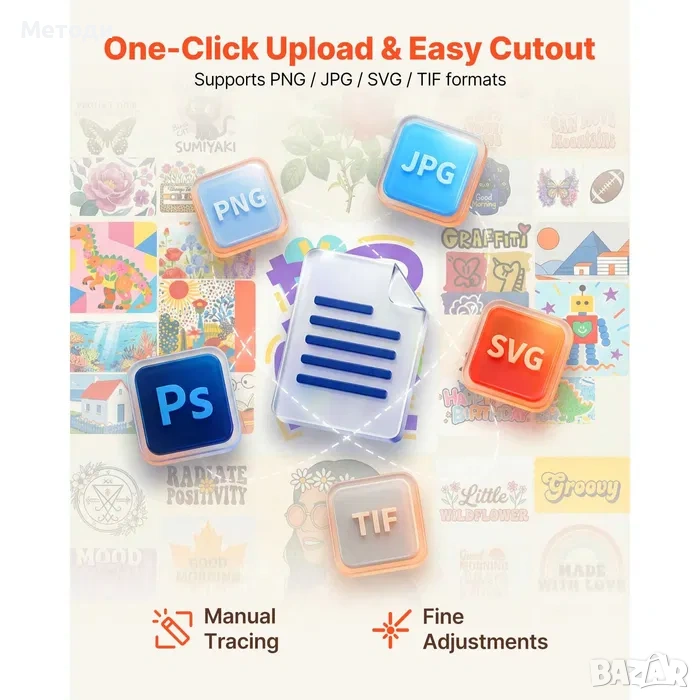 Поддържа различни файлови формати като SVG, PNG, JPG и други, което ти позволява лесно да импортираш собствени дизайни и да работиш с популярни графични програми.