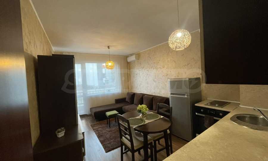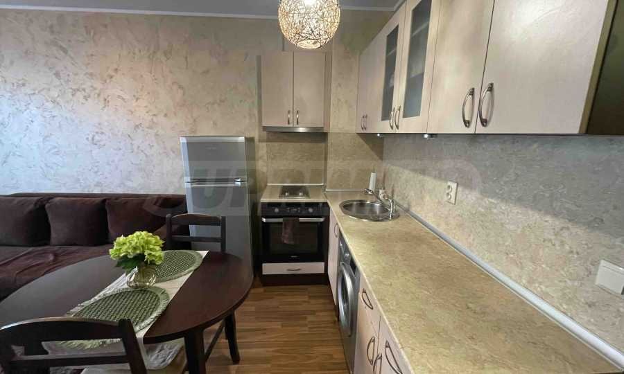 тераса.Жилището е напълно обзаведено и оборудвано с нови мебели и ел. уреди и очаква новите си наематели. Отоплението е решено с климатик.
