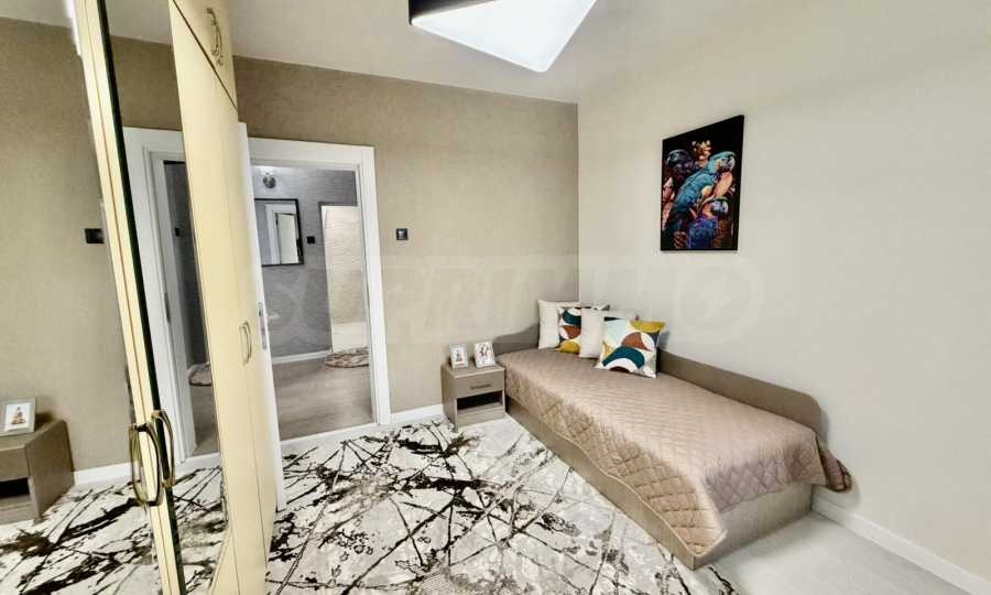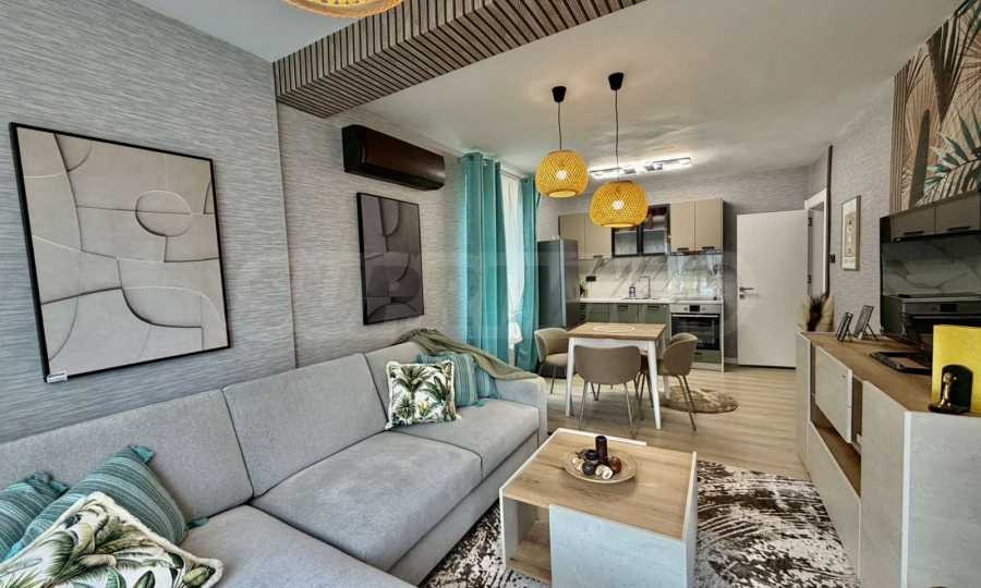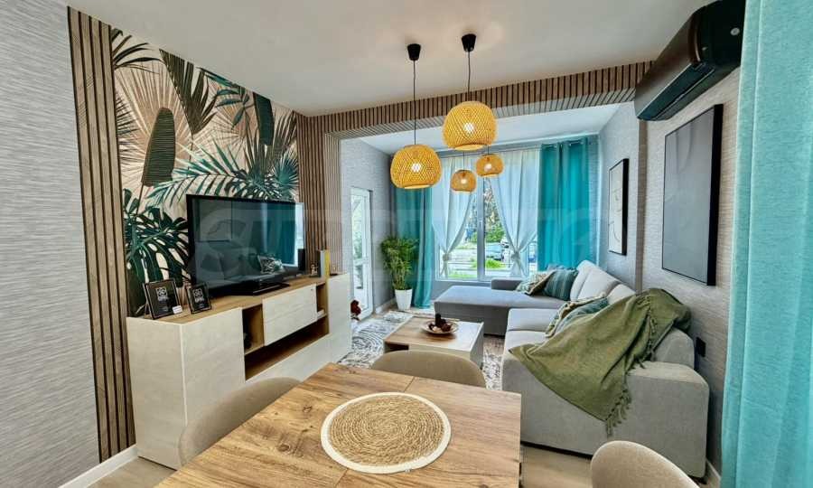 Апартаментът е след основен ремонт, с изцяло подновени ВиК и ЕЛ. инсталация. Напълно обзаведен и оборудванс всичко необходимо за живеене като мебели и ел. уреди, готов за нанасяне. Интериорът е завършен в модерен Urban Tropical стил, съчетаващ топлина, естествени материали и усещане за комфорт.