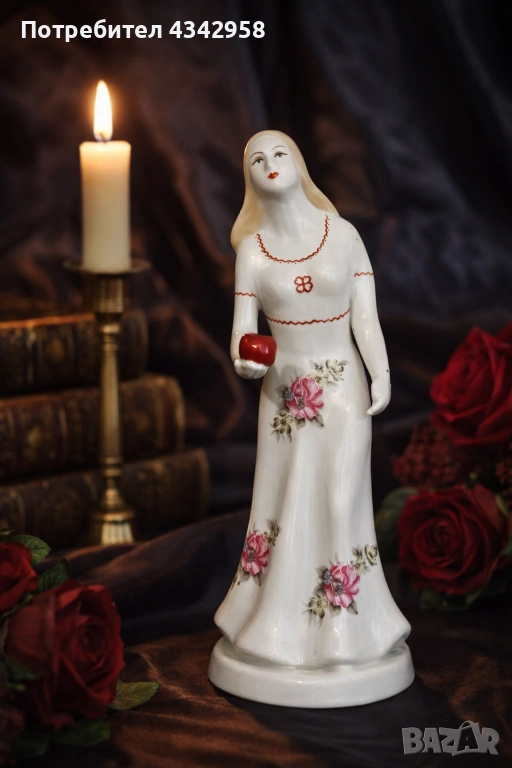 Елегантна винтидж порцеланова фигурка на жена с ябълка, произведена от фабриката Alba Iulia (Румъния) през периода 1960–1970 г.