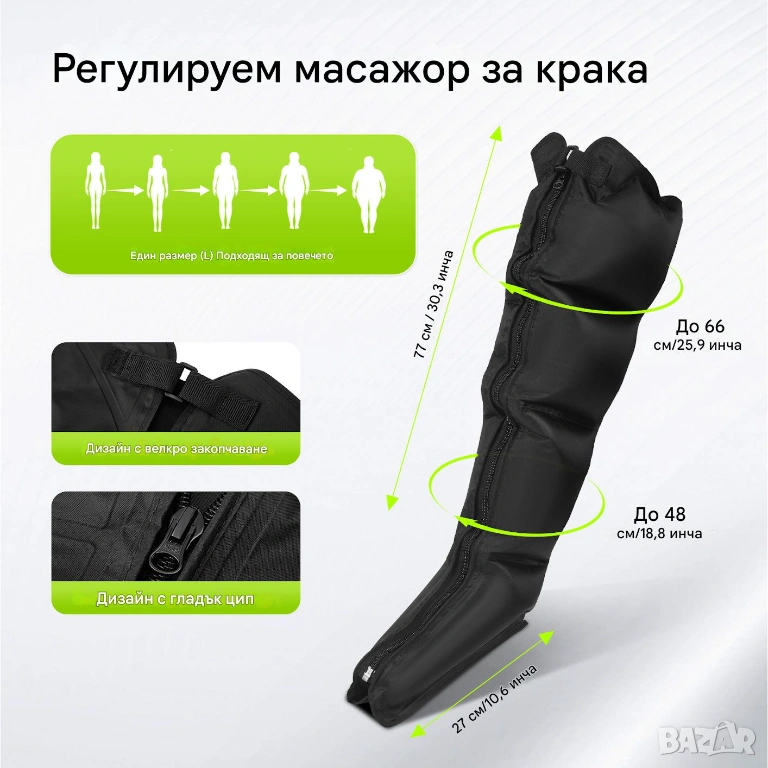 Уредът е създаден за максимален комфорт и лесна употреба – регулируемите ленти и ципове осигуряват перфектно прилягане към различни размери на тялото. Можеш да използваш масажорите за ръце и крака едновременно или поотделно – според моментните ти нужди.