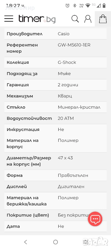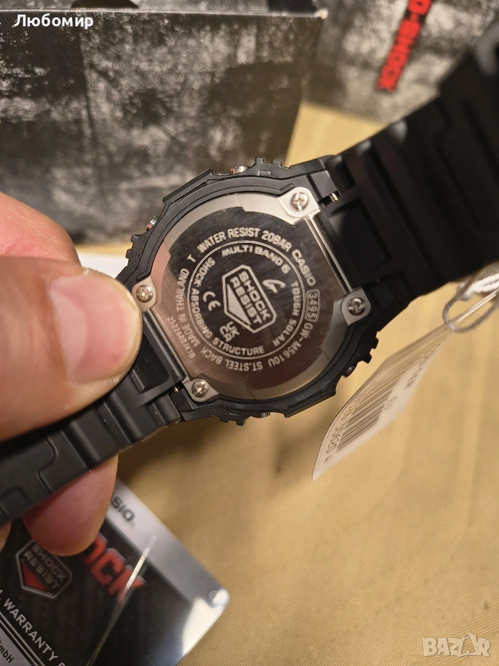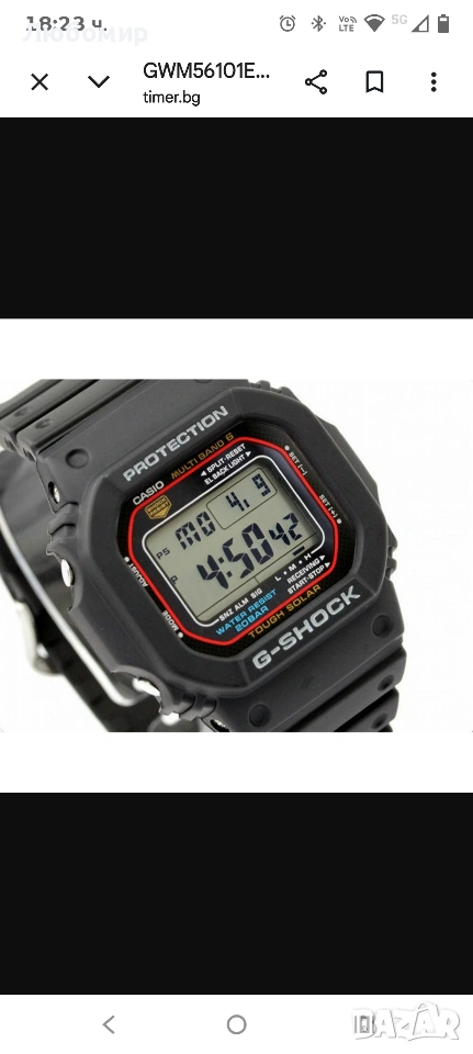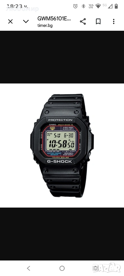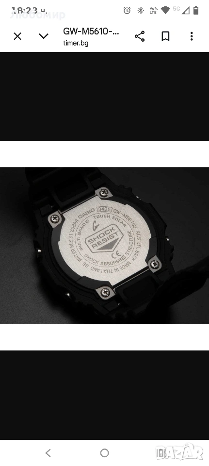 Налични 2 броя.Мъжки часовник G-Shock GW-M5610-1ER, изработен от висококачествен полимерен материал с много висока удароустойчивост и водоустойчивост. Притежава соларна клетка, която захранва батерията чрез слънчева светлина. Правоъгълен корпус в черен цвят и размери от 46.7 x 43.2 x 12.7 мм, сив дигитален дисплей. Функции: радио сверяване, световно време, таймер, хронограф, LED осветяване, 5 независими дневни аларми, автоматичен календар, 12/24 часови формат, 20 ATM водоустойчивост - позволява свободно плуване и гмуркане. 2 години живот на батерията, тегло от 52 грама