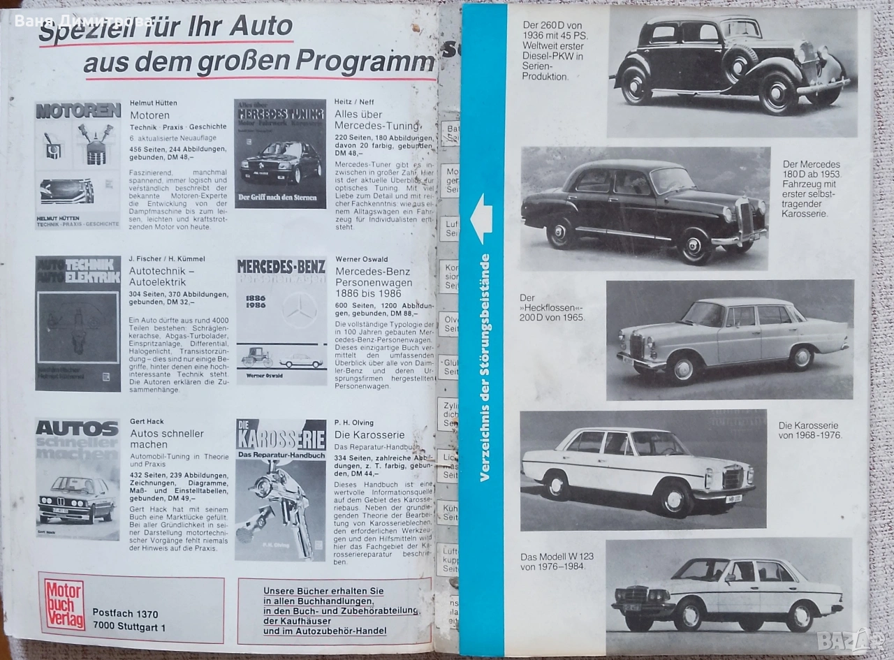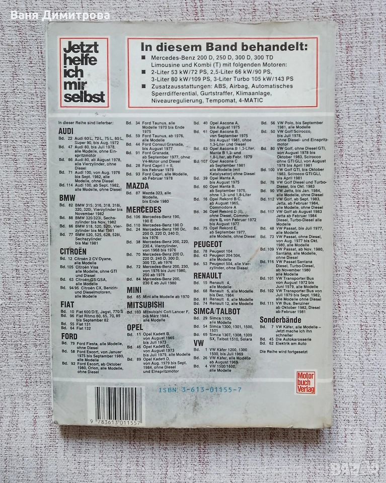 Практическа книга за ремонт и поддръжка на Mercedes-Benz дизелови модели (200D, 250D, 300D, 300TD Turbo) от 1984 г. Изданието е на немски език и съдържа полезни съвети, инструкции и насоки за диагностика и отстраняване на повреди. Подходяща както за любители, така и за по-напреднали.