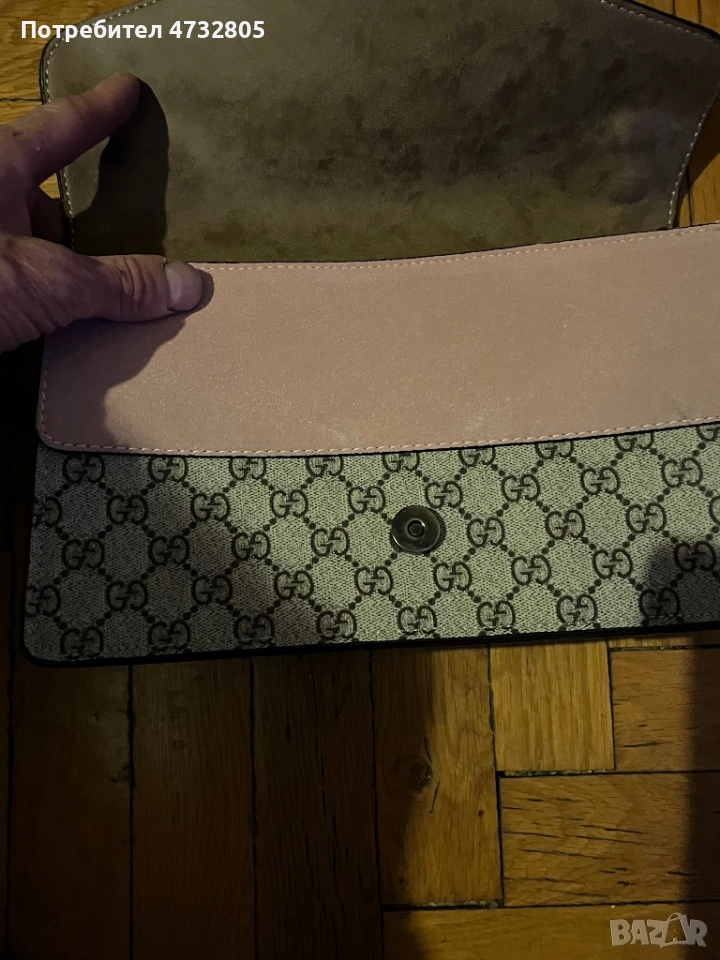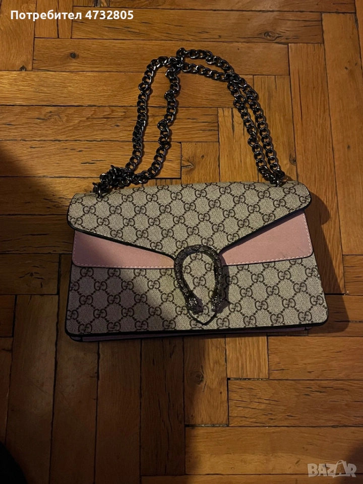 Чантата е изработена в класически GG десен, с елегантна верижка и ефектна метална закопчалка. Моделът е вдъхновен от един от най-популярните дизайни на марката, който се отличава със своята модерна визия и стилно излъчване.