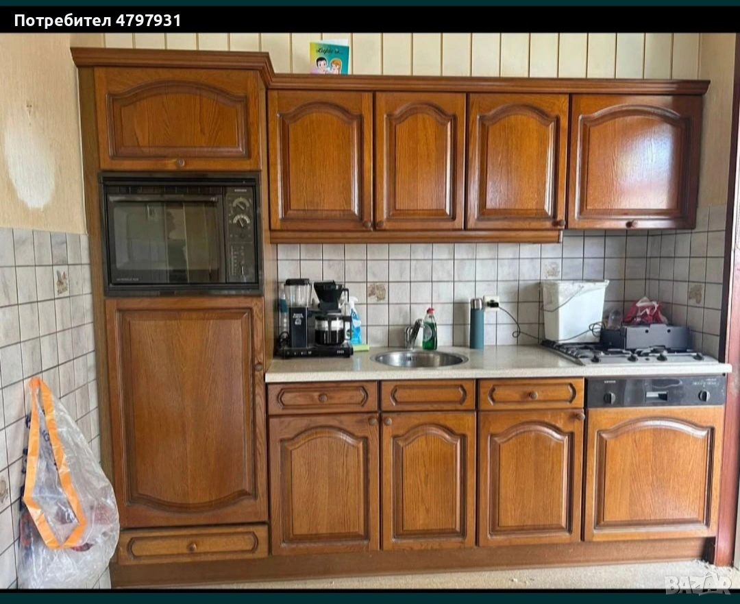 Права кухня с дъбови вратички и уреди-хладилник,фурна,газови котлони,съдомиялна,абсорбатор.Също тъка мивка,смесител и кухненски плот. Дължина на кухнята-251см.Внос от Холандия,разглобена на модули.