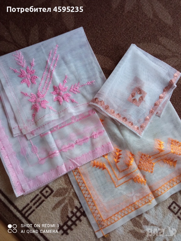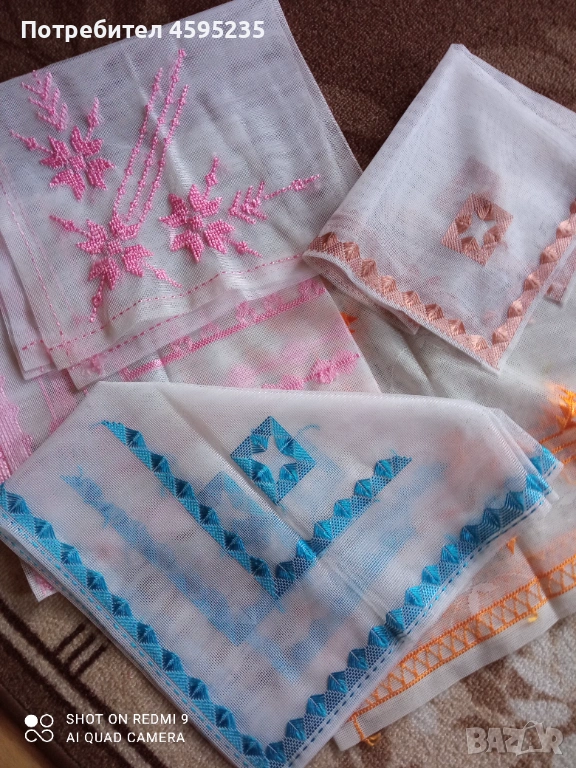 Мотиви: Геометрични и флорални мотиви, изпълнени с качествени конци в наситени цветове (розово, синьо, оранжево).