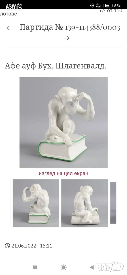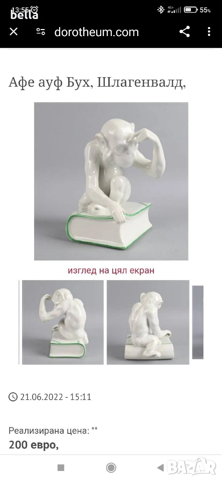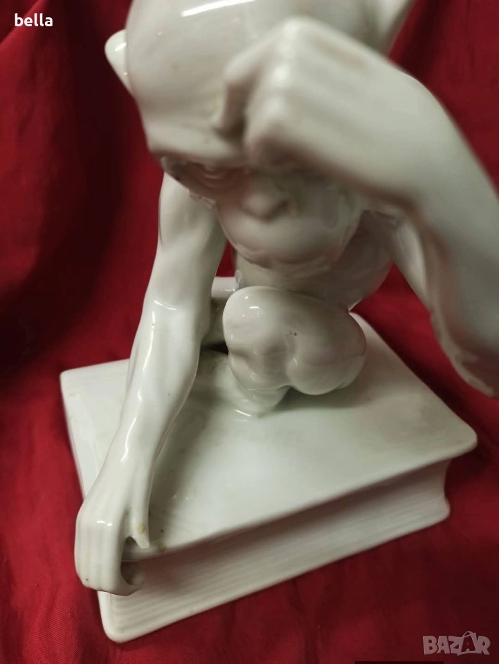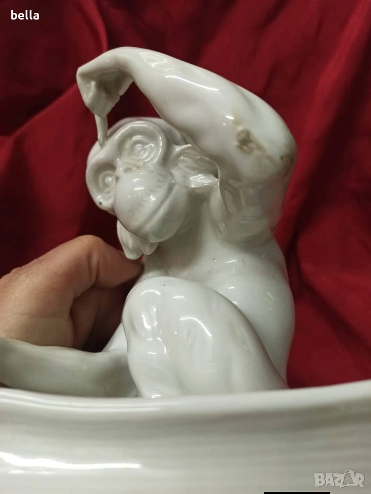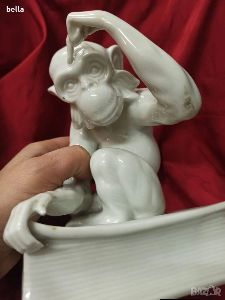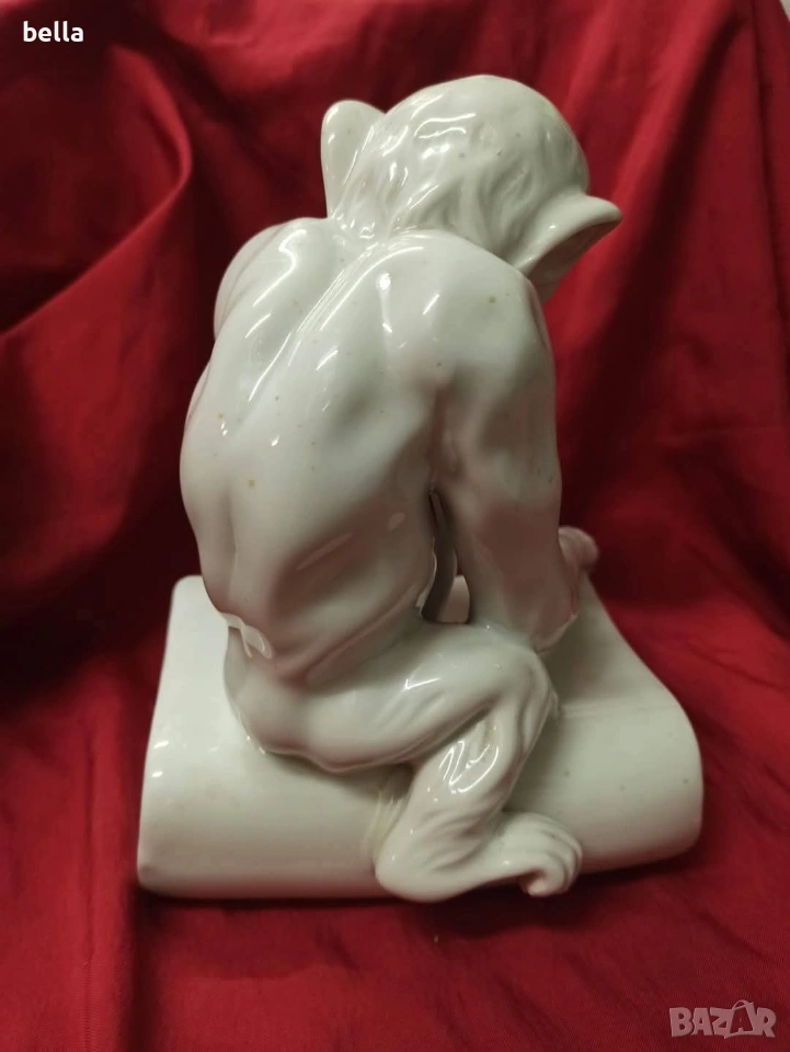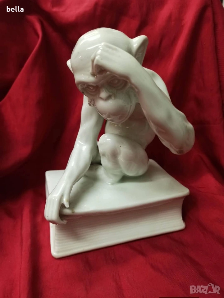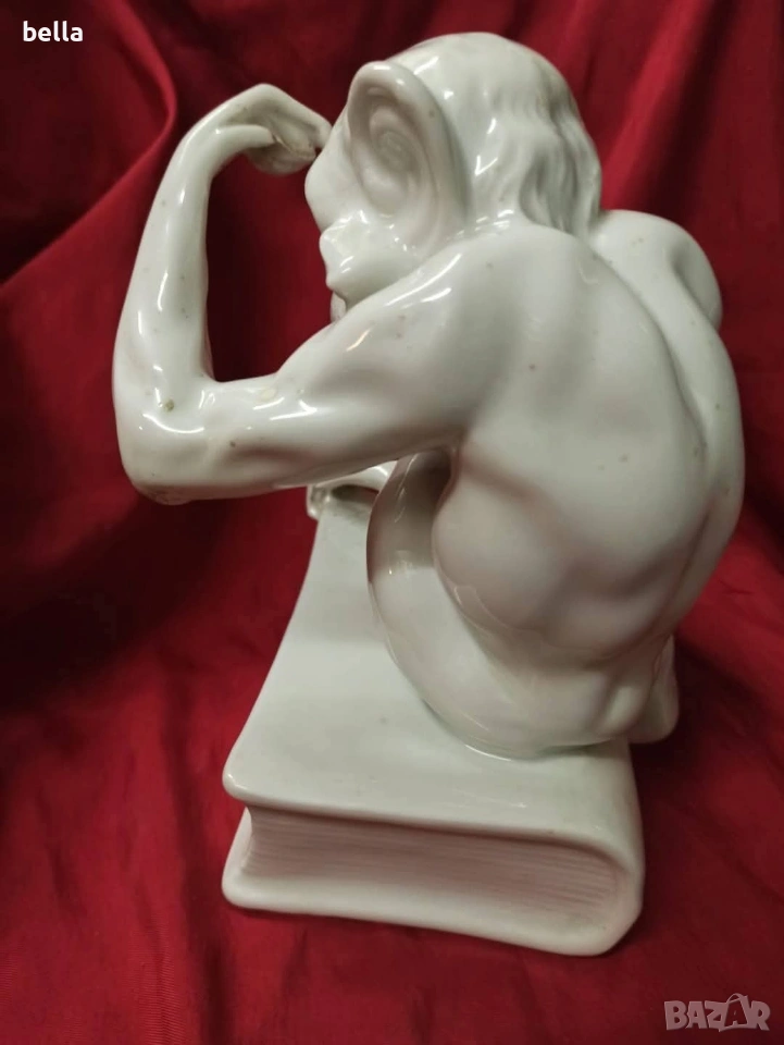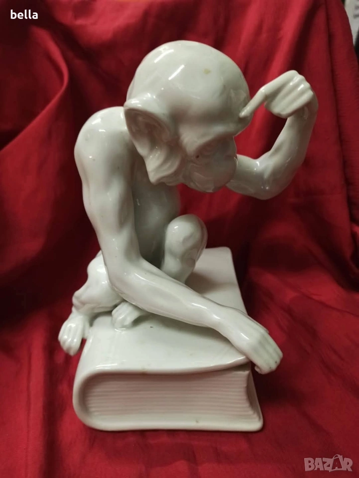 Изключително рядка порцеланова голяма пластика на маймуната с книга или по-известна като маймуната на Дарвин,пластиката е около 1900-1930 год в запазен вид както е видно височината е 16 см ,единствената която доста прилича по детайлно изпълнение на тялото лицето пръстите и т.н е тази от последните снимки Цена 250 евро