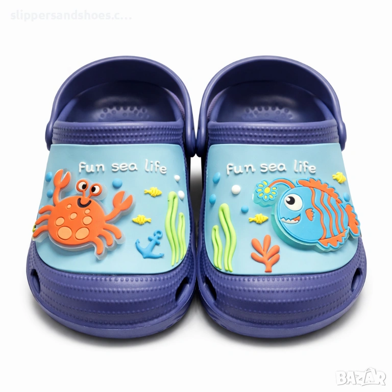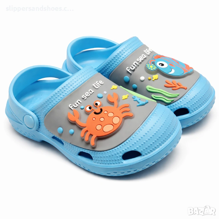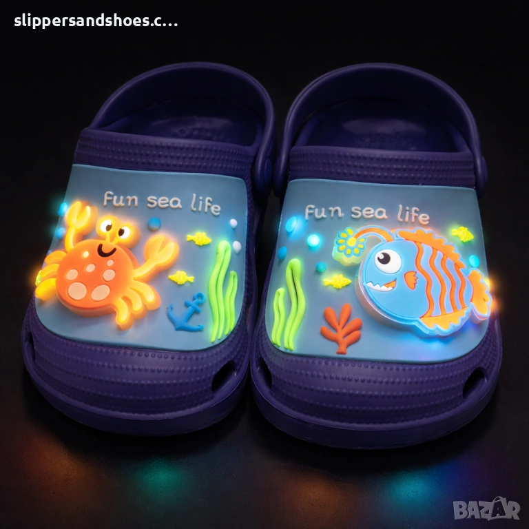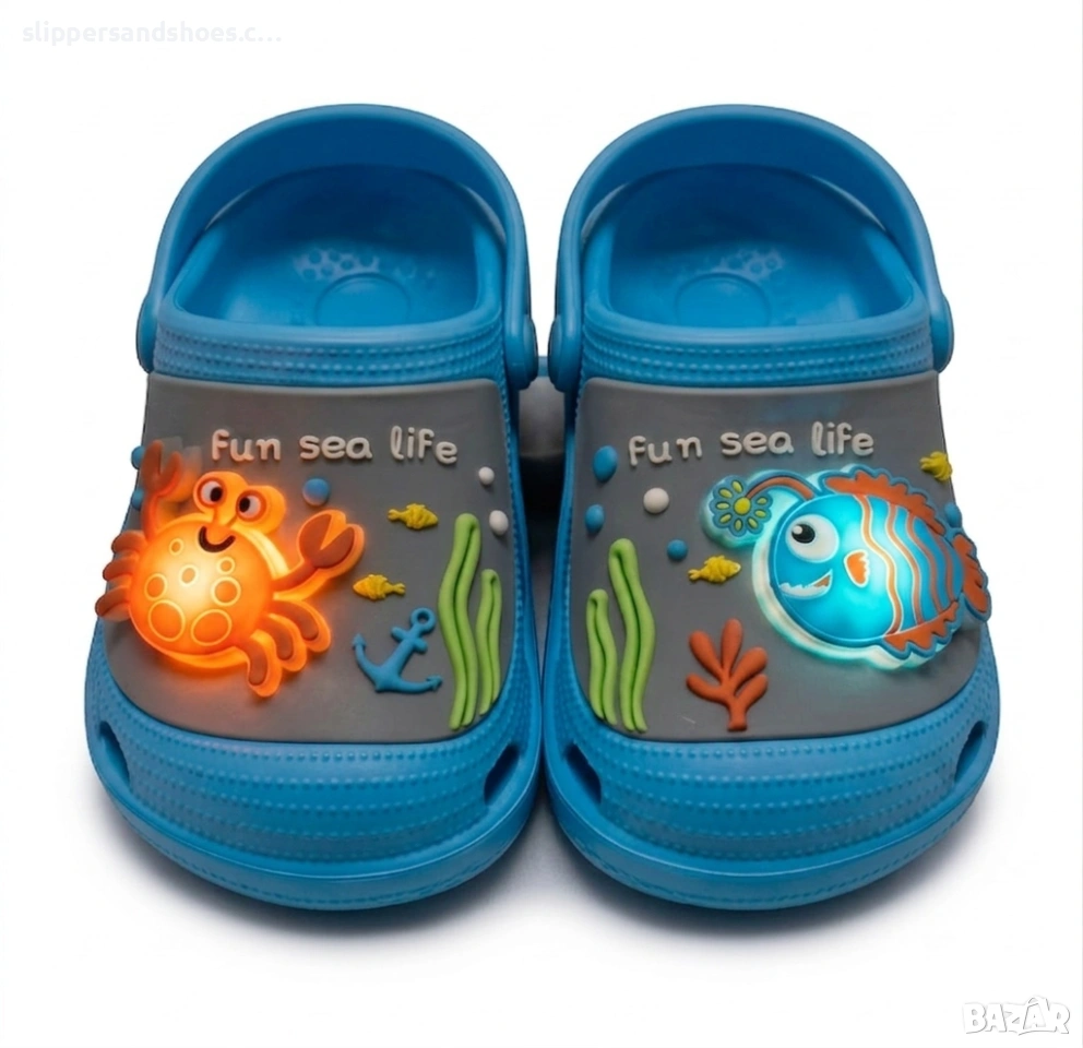 Открийте перфектната комбинация от комфорт, забавление и стил с тези детски чехли със светещи елементи. Моделът впечатлява с цветен дизайн с морски мотиви – весел рак и игрива рибка, които светят при движение и превръщат всяка разходка в приключение.