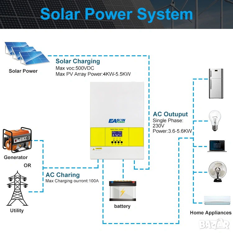 • Соларен контролер: MPPT с макс. мощност на панелите 5500W.