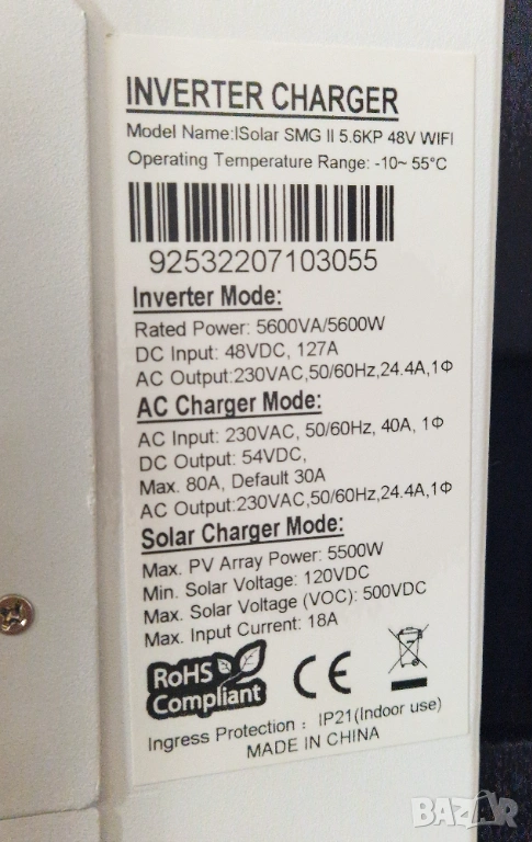 Хибриден соларен инвертор EASUN iSolar SMG II 5.6KP (5.6kW, 48V, WiFi), снимка 1 - Друга електроника - 54207176 Хибриден соларен инвертор EASUN iSolar SMG II 5.6KP (5.6kW, 48V, WiFi), снимка 2 - Друга електроника - 54207176 Хибриден соларен инвертор EASUN iSolar SMG II 5.6KP (5.6kW, 48V, WiFi), снимка 3 - Друга електроника - 54207176 Хибриден соларен инвертор EASUN iSolar SMG II 5.6KP (5.6kW, 48V, WiFi), снимка 4 - Друга електроника - 54207176 Хибриден соларен инвертор EASUN iSolar SMG II 5.6KP (5.6kW, 48V, WiFi), снимка 5 - Друга електроника - 54207176 1/5