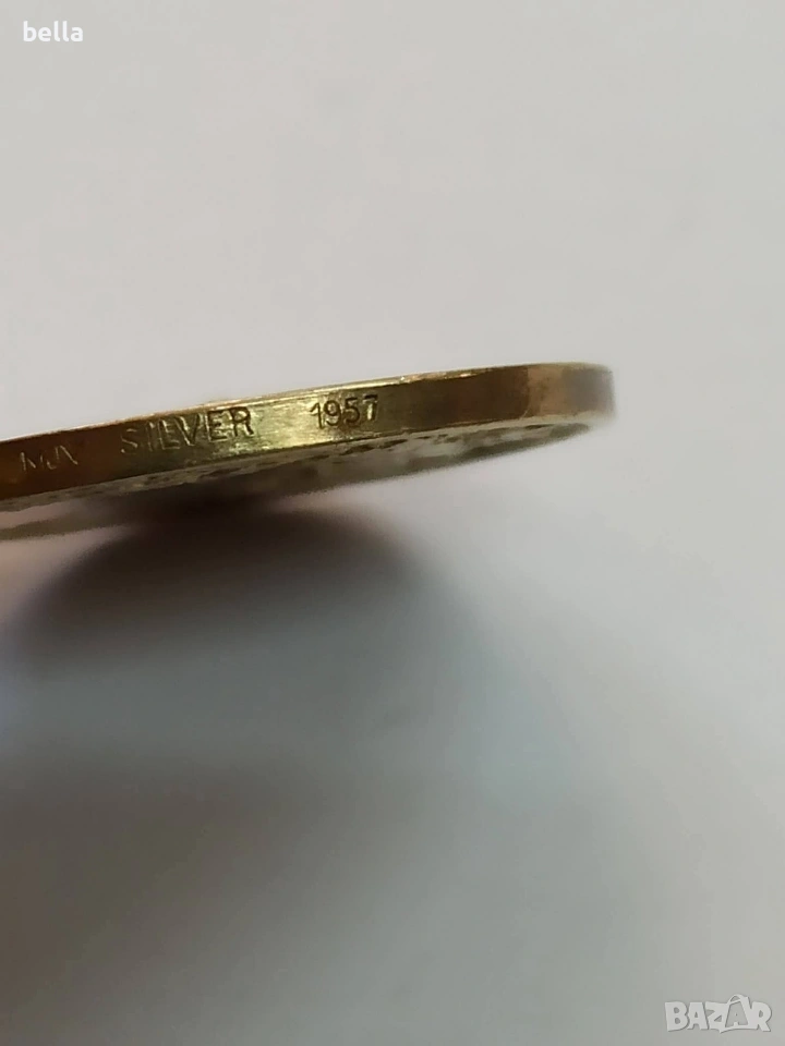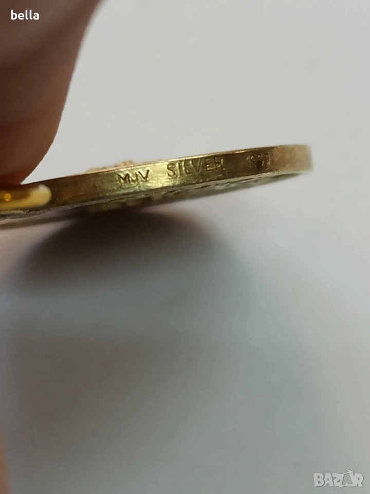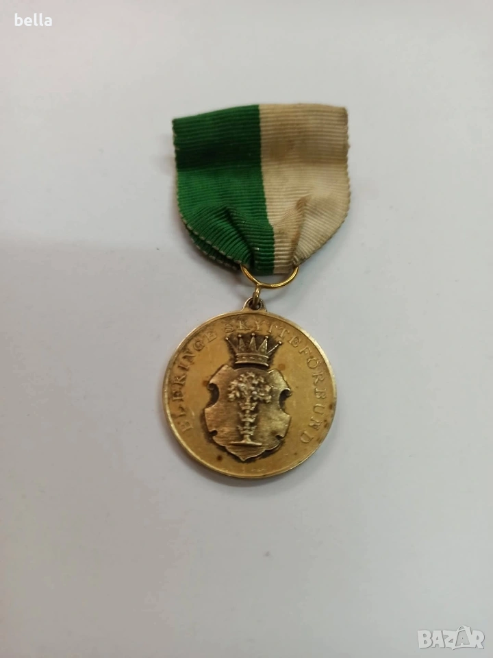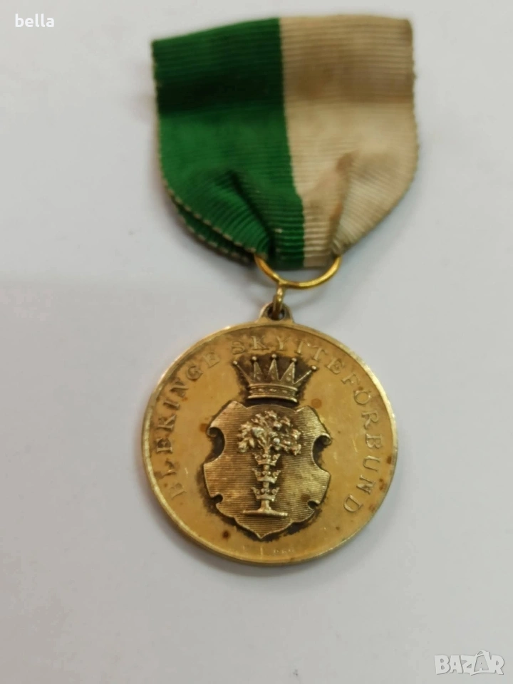 Рядък шведски кралски медал – сребро с позлата, MJV 1957.Оригинален шведски кралски медал „Belöning för nit och redlighet i rikets tjänst“, изработен от Mynt- och Juvelerverket (MJV) – официалния държавен монетен и ювелирен завод на Швеция.Медалът е от 1957 г., изработен от сребро с позлата, и е персонално връчен, с гравирано име ANDERSSON. Това е държавна награда, която не е масова и не е давана на всеки, а се е присъждала само за дългогодишна, безупречна и лоялна служба към държавата.Лицева страна – шведският държавен герб с кралска корона.Гръб – дъбов венец, символ на чест и достойнство.Оригинална зелено-бяла лента.Рядък колекционерски екземпляр, който рядко се среща на свободния пазар.Година: 1957.Произход: Швеция.Материал: сребро с позлата.Състояние: оригинално, с естествена патина.Цена 250 евро