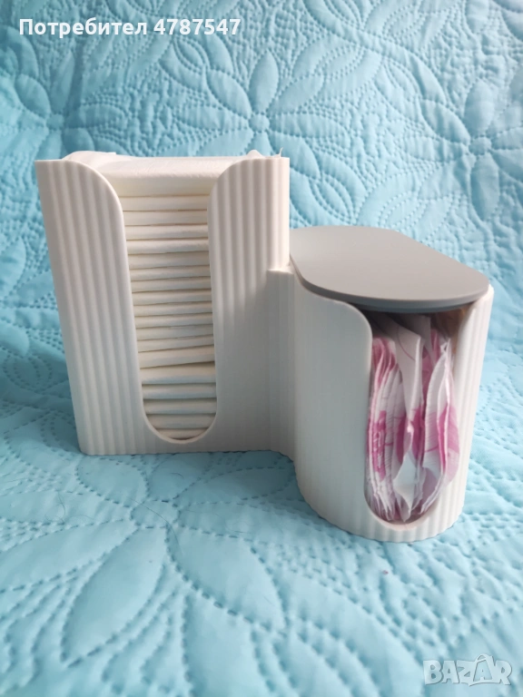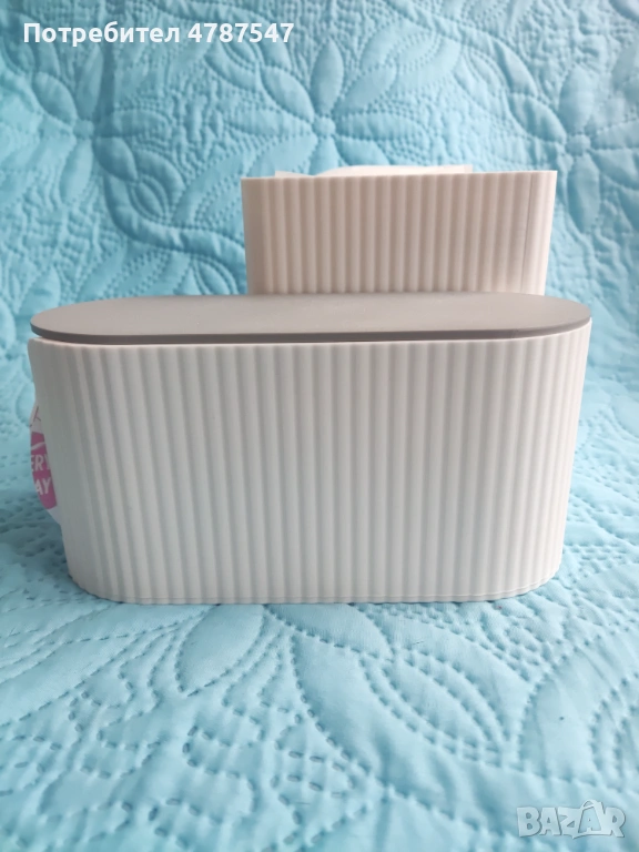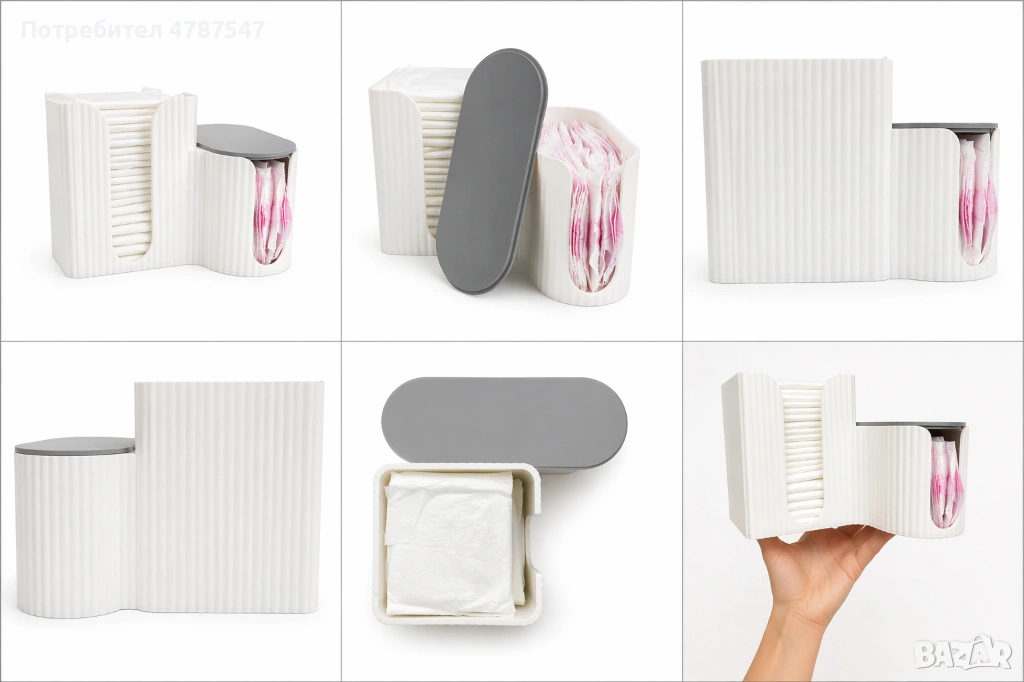 Разделен на два сектора – можеш да отделиш ежедневни от дамски превръзки. Разполага с практично капаче, което предпазва съдържанието от прах. Отворът позволява бързо и лесно взимане.