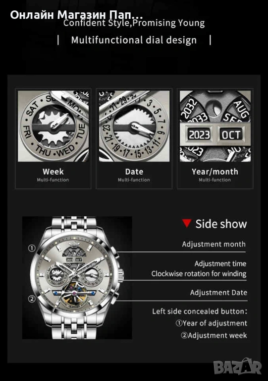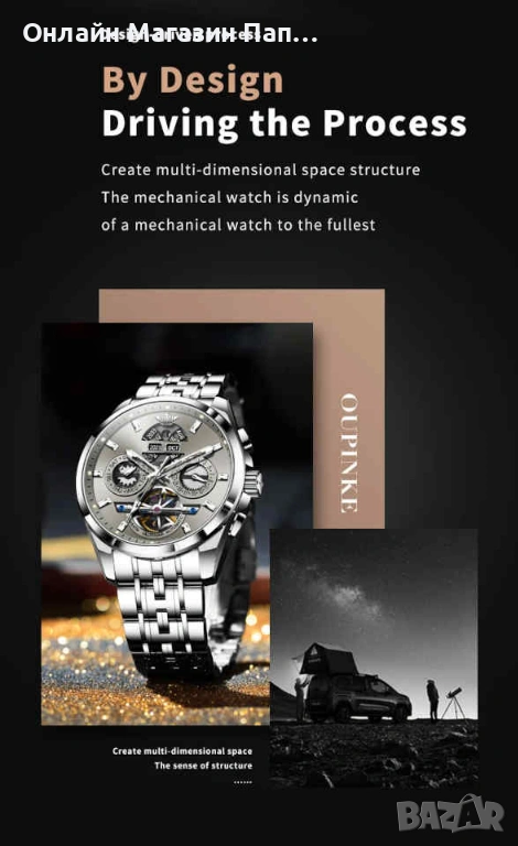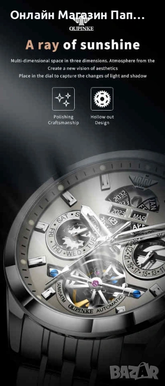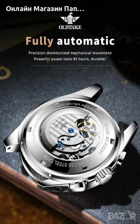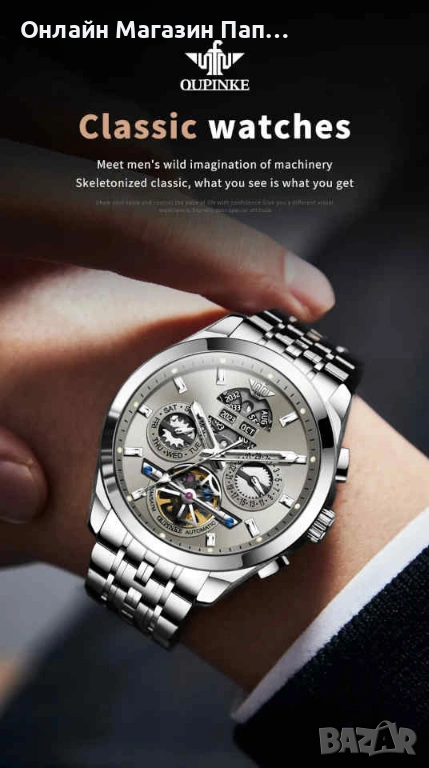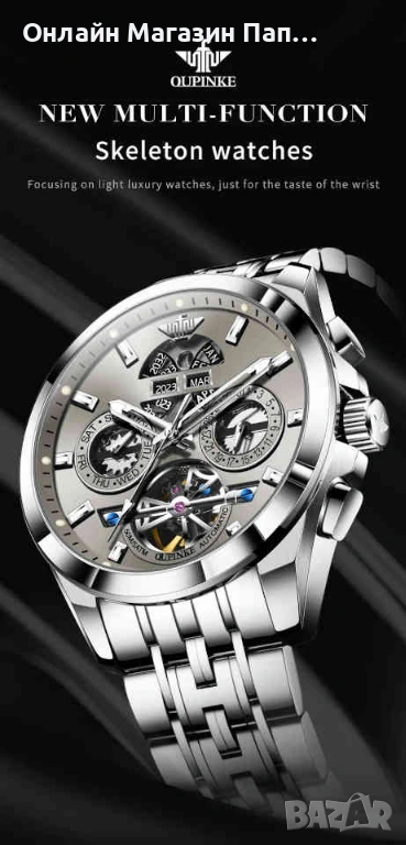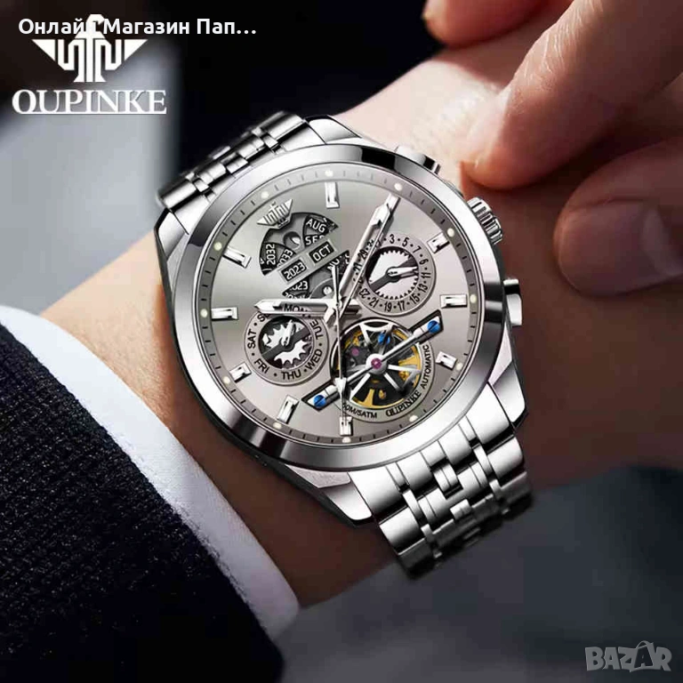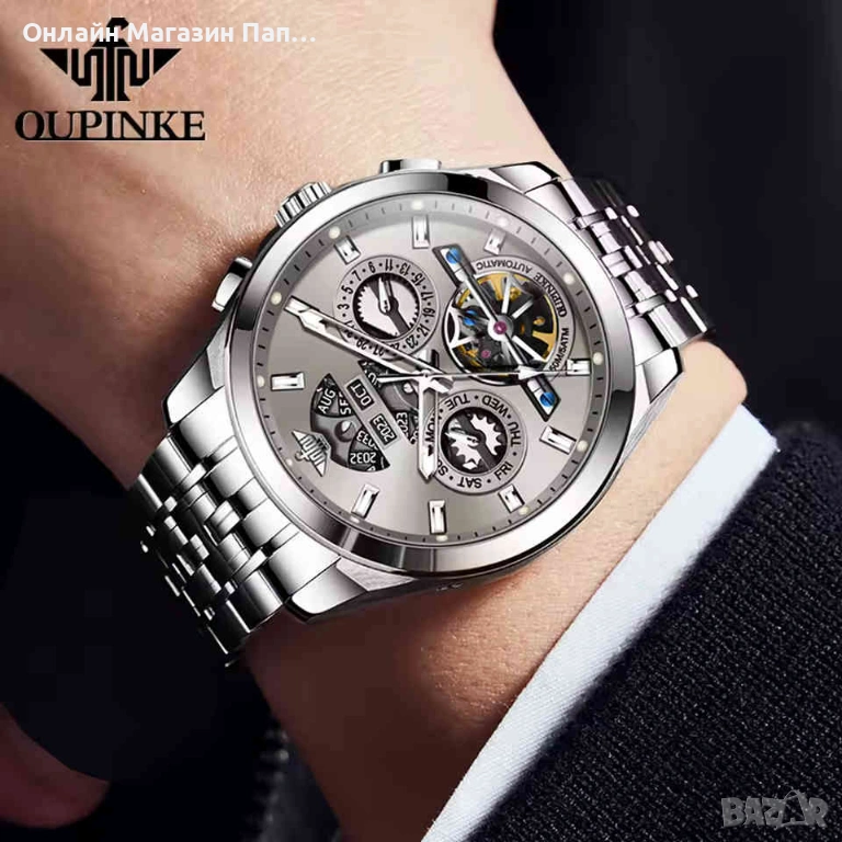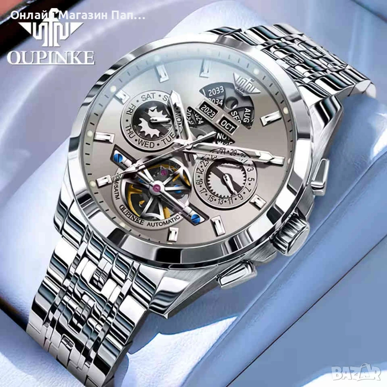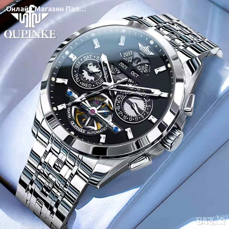 OUPINKE 3251 е луксозен мъжки автоматичен механичен часовник, който съчетава висок клас изработка с разширена функционалност. Моделът впечатлява с турбийон скелетон подциферблат, който разкрива част от механизма и придава динамичен и модерен вид.