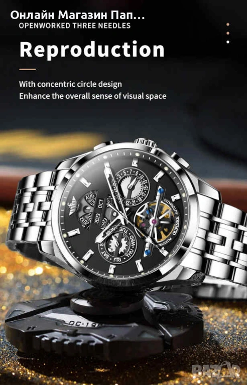 Оборудван с автоматичен механизъм със самонавиване, с възможност за ръчно навиване, моделът гарантира точност без нужда от батерия. Изчистеният циферблат без цифри подчертава елегантния и модерен дизайн.