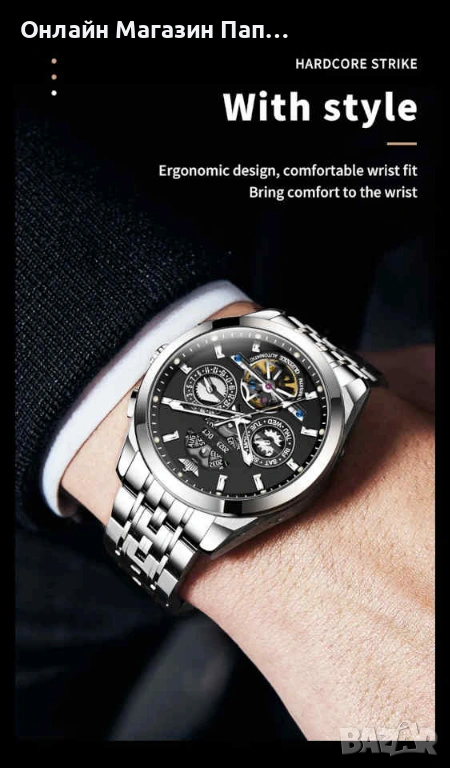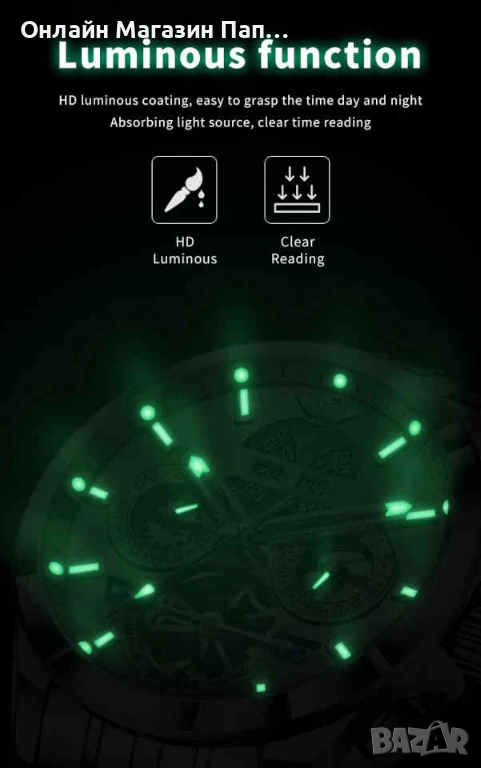 Със светещи стрелки и водоустойчивост 5Bar (50м), моделът е подходящ за ежедневно носене и издържа на контакт с вода.
