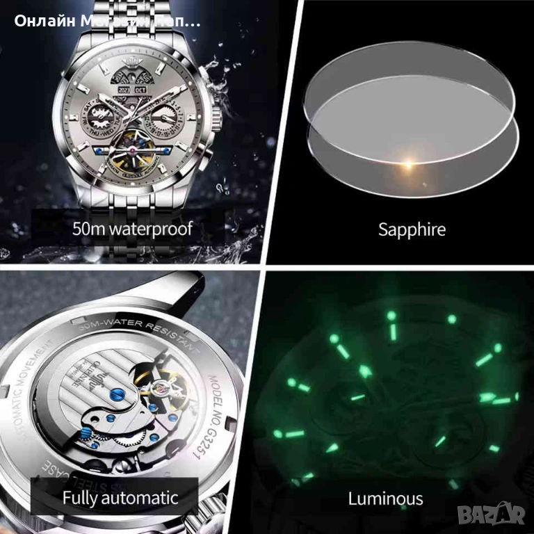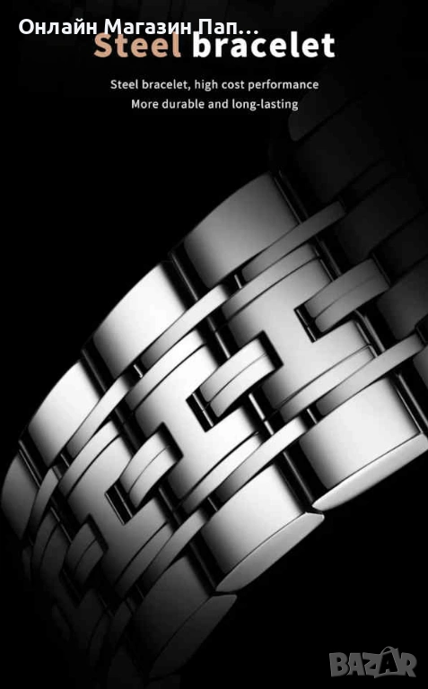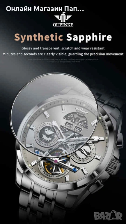 Защитен със сапфирено стъкло, часовникът предлага висока устойчивост на надраскване и удари. Корпусът и верижката от неръждаема стомана осигуряват здравина и луксозен вид, а скритата закопчалка с бутон добавя удобство и сигурност.