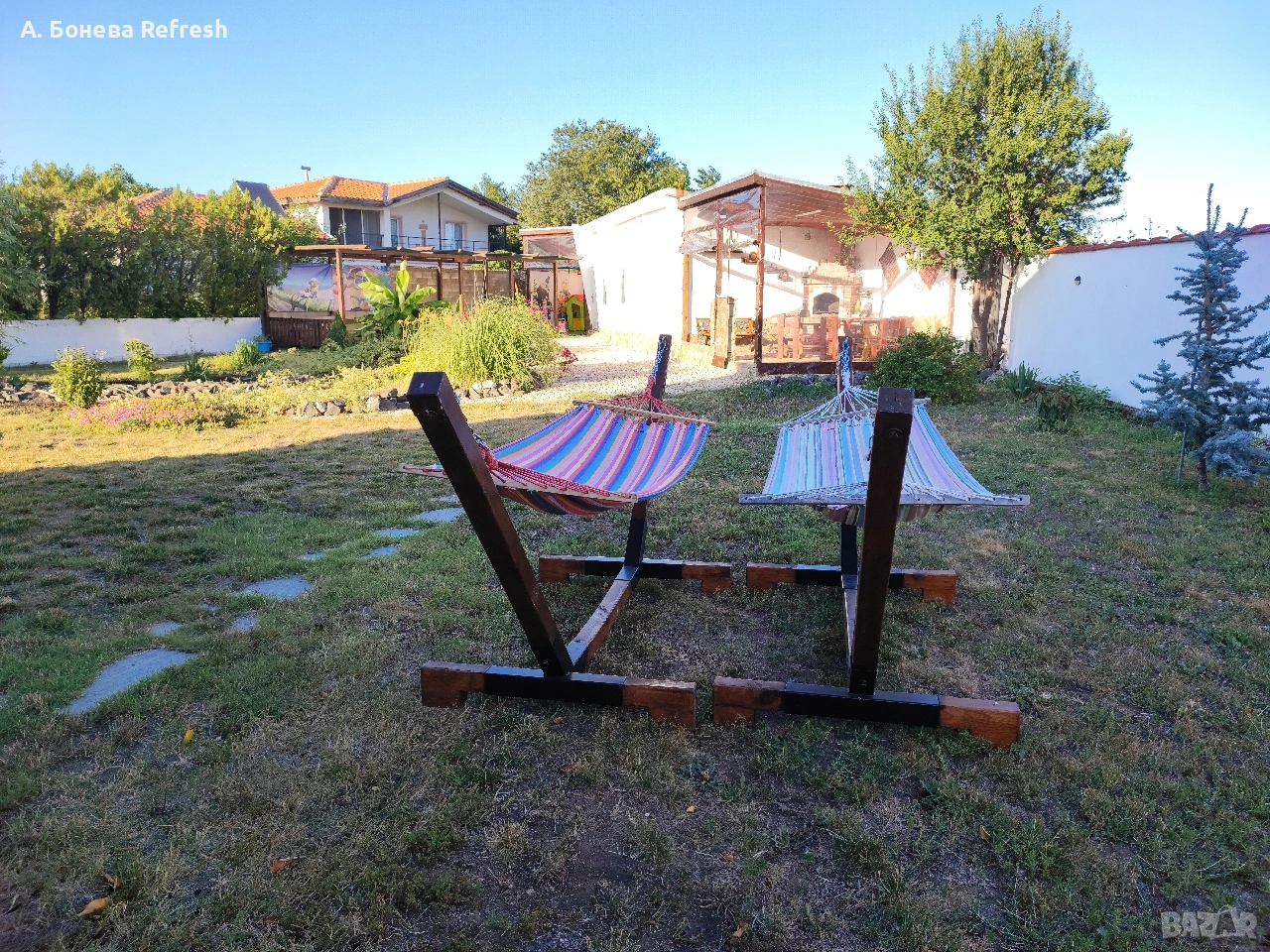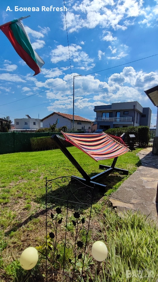Привет! Предлагаме единствени по рода си ръчно изработени стойки за хамак, направени от нас с много любов и часове труд! Нашето предложение отлично ще се впише във всеки двор, беседка, навес, веранда, тераса, дом, хотел, къща за гости, вила. Комплектът включва: - дървена основа - метални стойки - крепежни елементи - подарък хамак с цвят по избор Предимства: - Избор на цвят по желание на клиента - тъмен, светъл, опушен - Избор на цвят за самия хамак -За страната - изпращаме с ЕКОНТ и СПИДИ разглобени стойки -За Бургас - БЕЗПЛАТНА ДОСТАВКА + опция за сглобяване -За региона на Бургас - транспорт на НИСКИ ЦЕНИ - Времето за изработка до 10-12 работни дни -Лесно и бързо сглобяване От любов към дървото Bonev ART- ръчно изработени изделия от дървесина - последвайте ни и във Facebook #bonevart #ръчнаизработка #хамак #стойказахамак #релакс #градина #двор #дървесина #дърво