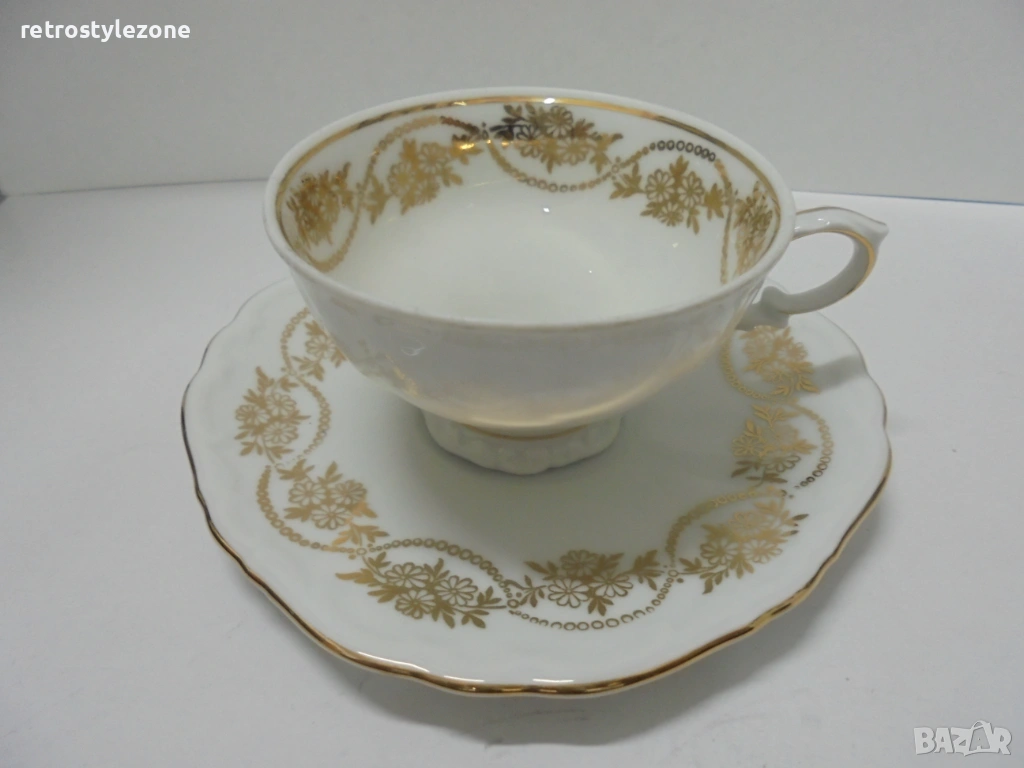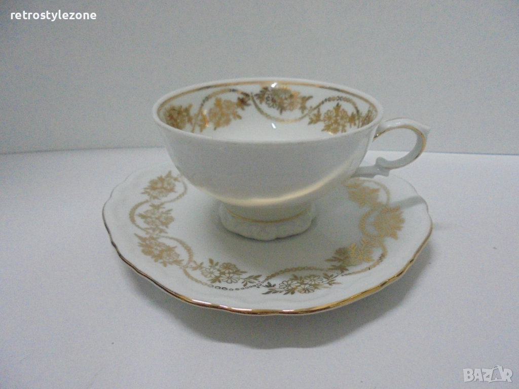 Двоен порцеланов сет – чаша с чинийка BareutherИзискан двоен порцеланов сет - Bareuther WALDSASSEN Bavaria– чаша с чинийка, отличаващ се с фин златист орнамент и деликатна изработка. Класически дизайн придаваy усещане за красота и традиция.Произход: Bavaria, Германия
