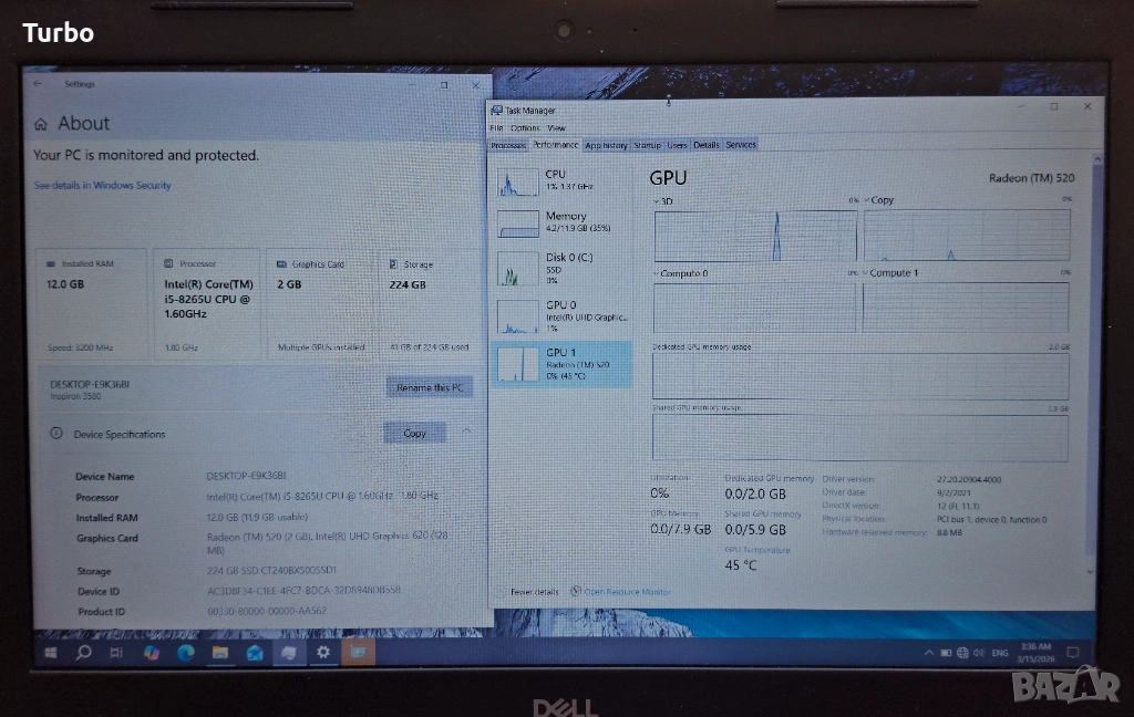 Видеокарта: AMD Radeon 520 със собствена памет (2GB GDDR5) + Intel UHD Graphics 620 (споделена памет)