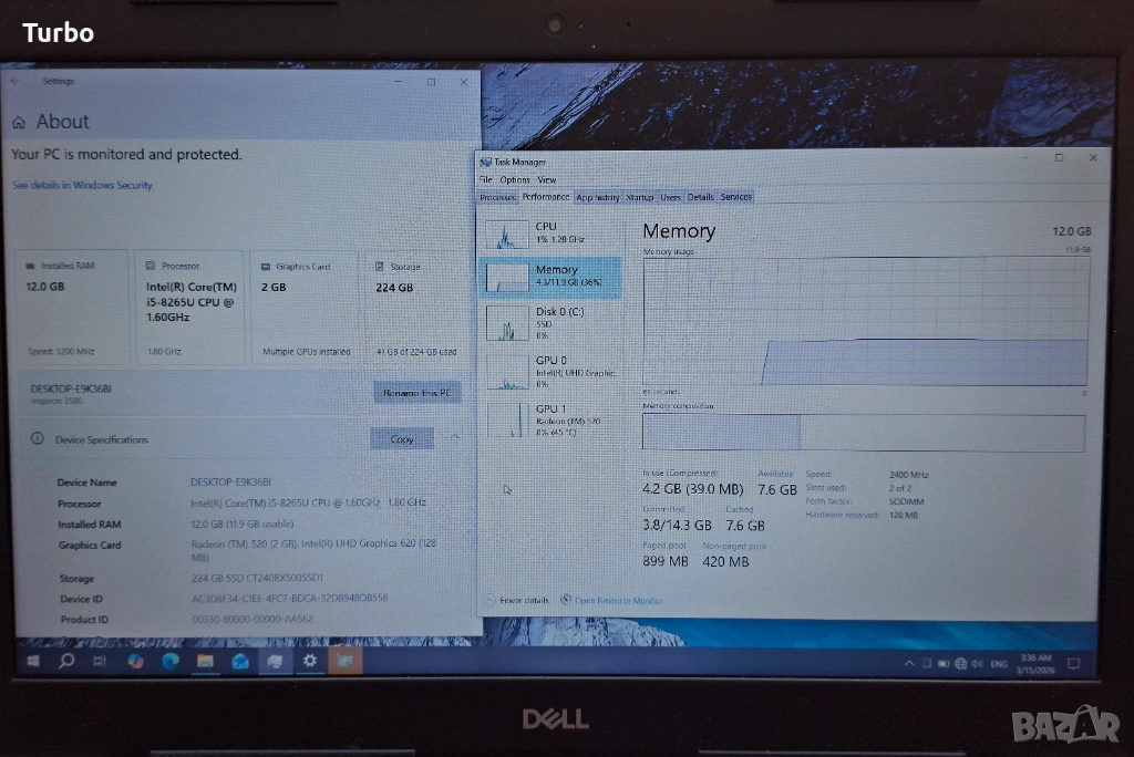 Подходящ е за умерен гейминг, графична работа, благодарение на процесора с 8-логически ядра, видеокартата с 2GB GDDR5 собствена памет и достатъчното количество 12GB РАМ памет. Дисплеят е матов, Full HD. В комплект с оригинално зарядно устройство. Батерията държи до 20 минути, съобразено с ниската цена. Точният модел е Dell Inspiron 3580.