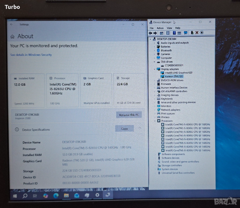Лаптопът е технически безупречен, с нормални козметични забележки. Разполага с мощен Intel Core i5-8265U процесор с 4-физически 8-логически ядра и видеокарта AMD Radeon 520M със собствена 2GB GDDR5 памет. Бърза 12GB DDR4 рам памет и 240GB SSD. Лаптопът е на едва 200 дни работа, включва се за секунди и работи светкавично бързо.