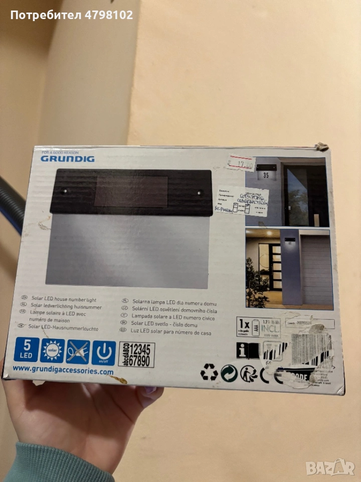 Използвана лампа с номер на адрес от марката Grundig. Лампата има LED осветление и може да се използва за осветяване на входа или номера на дома.За да светне трябва да е стояла на слънце през деня