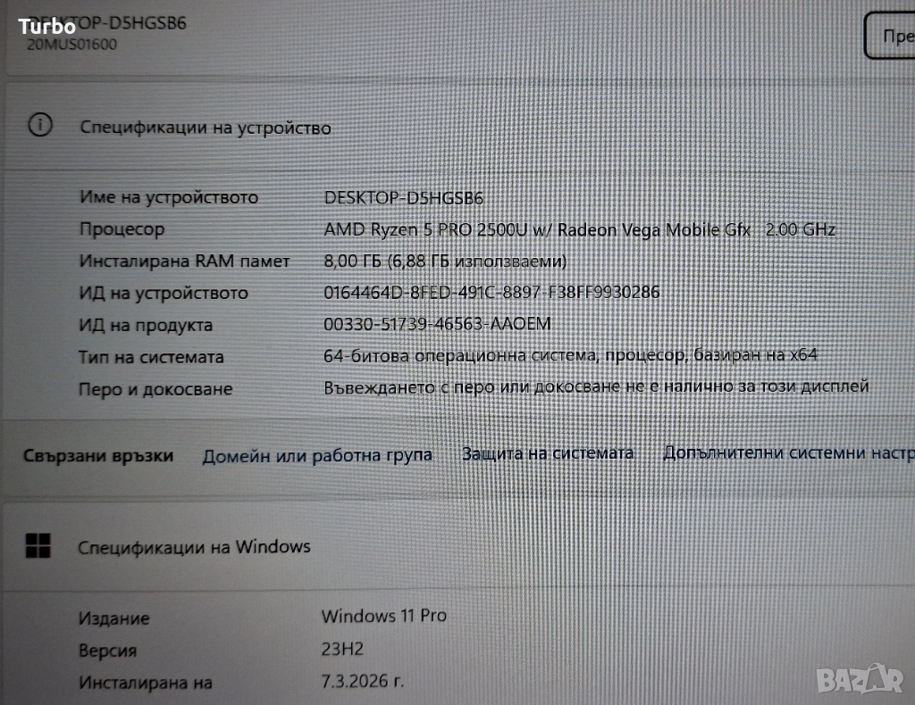 Процесор: AMD Ryzen 5 PRO 2500U – (4-ядрен, 8-нишков, 8x3.6 GHz GHz, 6M Cache). Един от най- производителните процесори от AMD Ryzen 5 с отлична производителност и енергийна ефективност.
