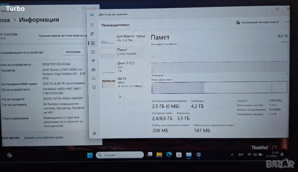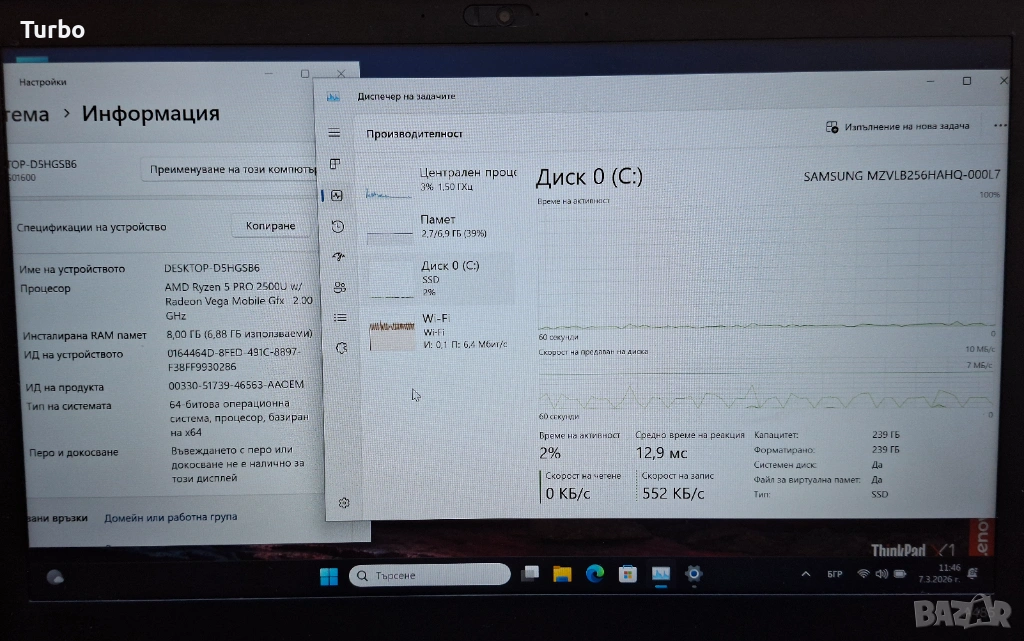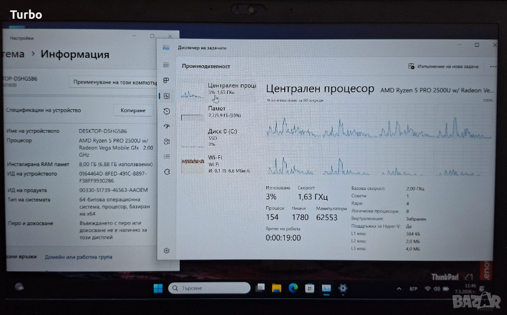 Лаптопът е в перфектно техническо състояние, с нормални козметични забележки. Висококачествен бизнес лаптоп от серията ThinkPad на Lenovo. Разполага с истински четириядрен процесор AMD Ryzen 5 Pro 2500U с 4 физически и 8-логически ядра. Изключително бързо 256GB Intel SSD NVMe и 8GB DDR4 2400Mhz РАМ памет. Дисплеят е IPS, Full HD, матов. Лаптопът е на едва 82 дни работа, а батерията е на едва 12% износване. С по-голямата шестклетъчна батерия за модела, издържа до 5 часа.