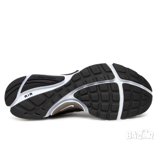 Nike Air Presto в класическа цветова комбинация "Black/White/Black" (черно и бяло). Този модел е известен с прозвището си „тениска за краката“ (T-shirt for your feet) заради изключителния си комфорт и еластичност.