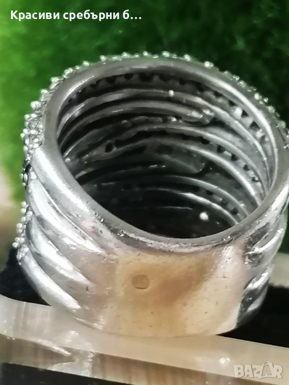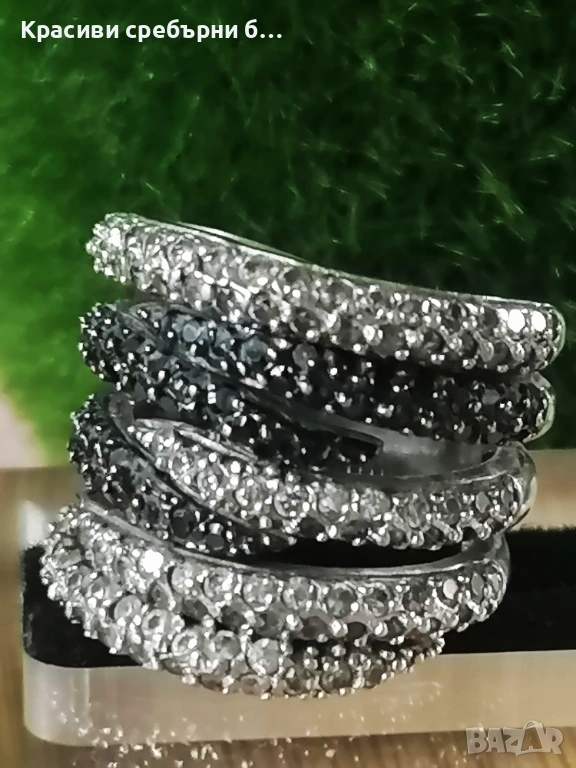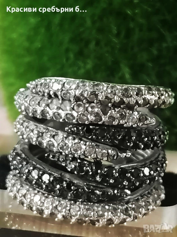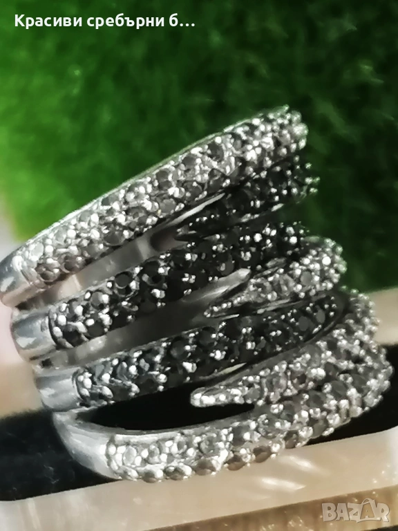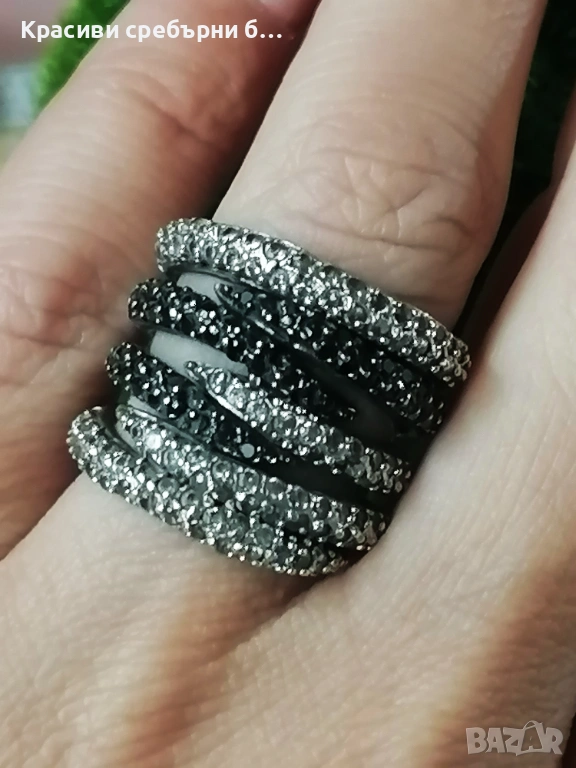 Впечатляващ, масивен сребърен пръстен с множество инкрустирани камъчета прозрачен и черен циркон, Халката е широка и удобна за носене